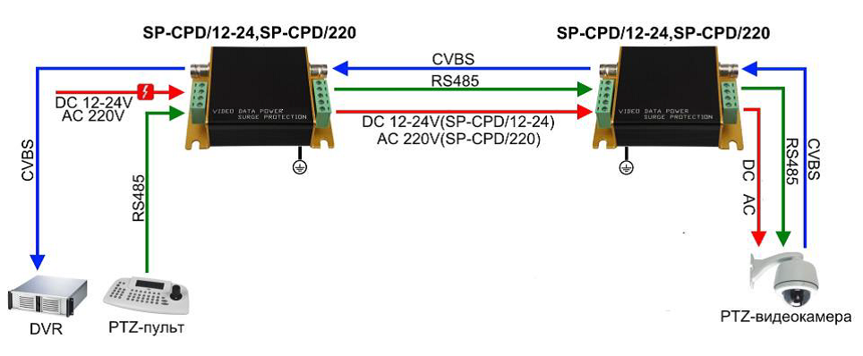 Одноканальное устройство грозозащиты SP-CPD/12-24 предназначено для защиты цепей питания, линий передачи видеосигнала и данных от импульсов высокого напряжения и тока. Данное устройство идеально подходит для предотвращения выхода из строя поворотной камеры в результате воздействия разряда молнии. Видео: 1 вход (BNC-мама), 1 выход (BNC-мама), питание и данные: 1 вход (клеммы), 1 выход (клеммы). Две степени защиты. Цепь питания 12-24В, нагрузка 0,5А.