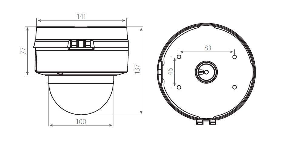 Габаритные размеры устройства Ø141 х 137 мм. Диапазон рабочих температур от -40 °C до +50 °C. Питание 12 В, PoE.