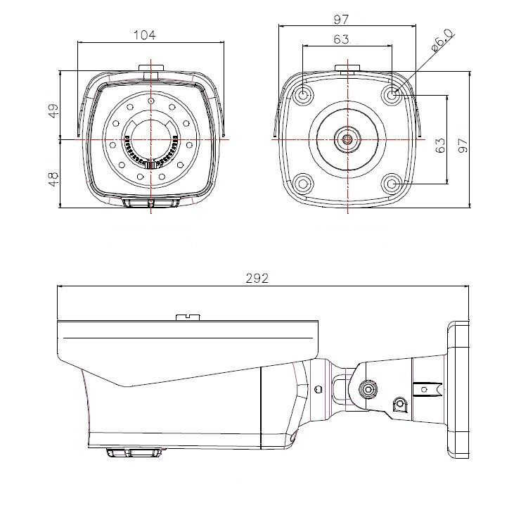 Габаритные размеры устройства 104 х 97 x 292 мм. Диапазон рабочих температур от -40 °C до +45 °C. Питание 12 В, PoE.