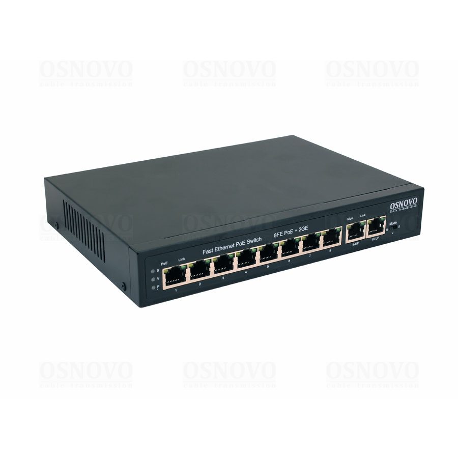 PoE коммутатор SW-20820(120W) на 10 портов (далее по тексту – коммутатор) предназначен для передачи данных между сетевыми устройствами и подачи питания к ним по кабелю витой пары по технологии PoE (Power Over Ethernet) на расстояние до 100м. Коммутатор оснащен 8-ю портами Fast Ethernet (10/100 Base-T) с поддержкой PoE к каждому из которых можно подключать сетевые устройства. Порты соответствуют стандартам PoE IEEE 802.3af/at и автоматически определяют подключаемые PoE-устройства. Максимальная выходная мощность на один порт составляет 30 Вт. При этом общая выходная мощность на 8 портов (PoE бюджет) составляет 115 Вт, что соответствует мощности в 14.4 Вт на порт при загрузке всех 8-и портов одновременно. Первый FE порт имеет возможность подавать PoE двумя методами для запитывания подключенных к нему PoE устройств (метод A 1,2(+) 3,6(-) и метод B 4,5(+) 7,8(–)). Кроме того в SW-20820(120W) предусмотрены два отдельных Gigabit Ethernet (10/100/1000 Base-T) Uplink-порта для подключения коммутатора к локальной сети, сети Ethernet или другому коммутатору. Питание коммутатора осуществляется от сети AC 100-240V. Максимальная потребляемая мощность 120 Вт