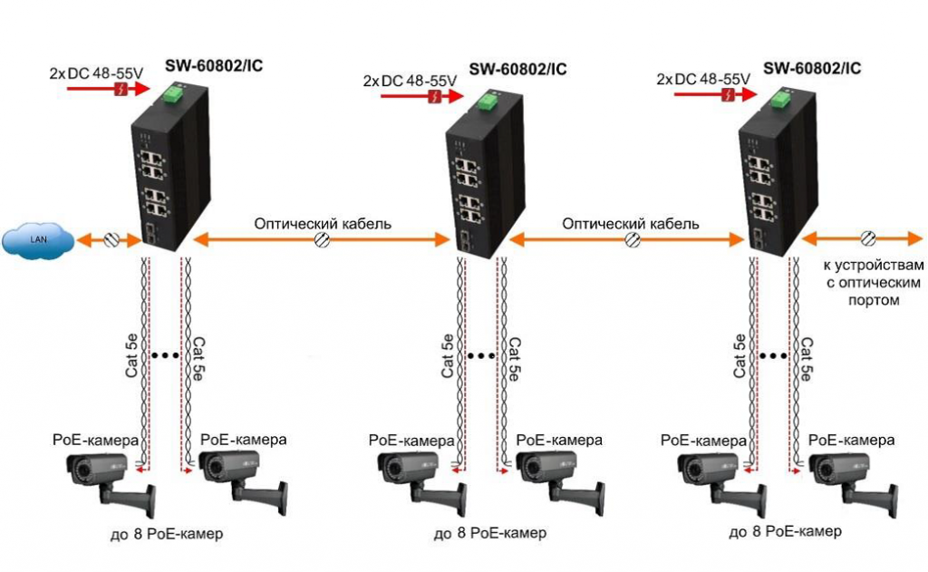 Промышленный PoE коммутатор на 10 портов SW-60802/IC предназначен для соединения нескольких узлов сети и передачи данных. Благодаря широкому диапазону выходного напряжения DC48V-DC55V может работать с промышленными блоками питания (блок питания в комплект поставки НЕ ВХОДИТ). 8 портов Fast Ethernet (10/100/1000 Base-T) соответствуют стандартам PoE IEEE 802.3af/at и автоматически определяют подключенные к ним PoE-устройства. Наличие двух Gigabit Ethernet SFP-слотов (10/100/1000 Мбит/с) для подключения к оптическим линиям связи. К каждому из 8 портов можно подключать PoE устройства мощностью до 25 Вт (общая выходная мощность до 200 Вт). Наличие встроенной грозозащиты 4кВ на порт. За счет компактного корпуса со степенью защиты IP30 коммутатор монтируется на стену или DIN-рейку. Наличие клемм для резервного питания. Защита от перегрузки по току.