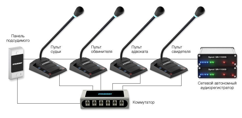 SX-201 / 4+1 - 5-канальная система конференц-связи с 5 - канальной системой записи переговоров предназначена для использования в судебных заседаниях. Дальность связи до 300 м. 4-х проводная линия связи. Благодаря автономному сетевому аудиорегистратору Спрут-SR возможно удаленное прослушивание разговоров. Благодаря функции громкого оповещения позволяет участникам процесса свободно общаться между собой, не повышая голоса и обеспечивает высокую разборчивость речи собеседников.