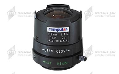 Предназначен для организации видеонаблюдения внутри помещений с относительно постоянным уровнем освещенности. Формат 1/3". Фиксированное фокусное расстояние 2.6 мм. Ручное управление диафрагмой. Диапазон изменения диафрагмы F1.6-11C. Тип крепления объектива CS. Имеет простую и компактную конструкцию.