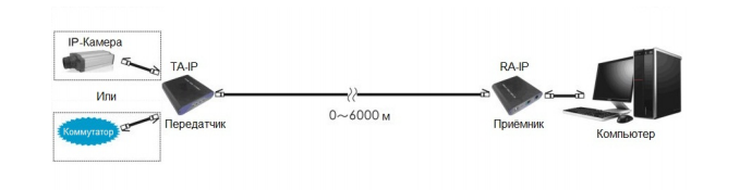 Комплект удлинителя Ethernet TA-IP+RA-IP с передатчиком и приемником. Передача данных по Ethernet-соединению на расстоянии до 6000 м. Скорость передачи от 0,25 мб/с (6000 м) до 148 мб/с (150 м).