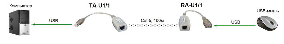 Удлинитель TA-U1/1+RA-U1/1 USB 1.1 интерфейса для клавиатуры и мыши по кабелю витой пары (CAT5/5e/6) на расстояние до 100 метров, USB звуковые платы и т.д до 70 метров. Пассивный, не требует внешнего источника питания. Скорость передачи до 12 Мбит/с. Комплект (приемник+передатчик). Блистерная пластиковая упаковка.