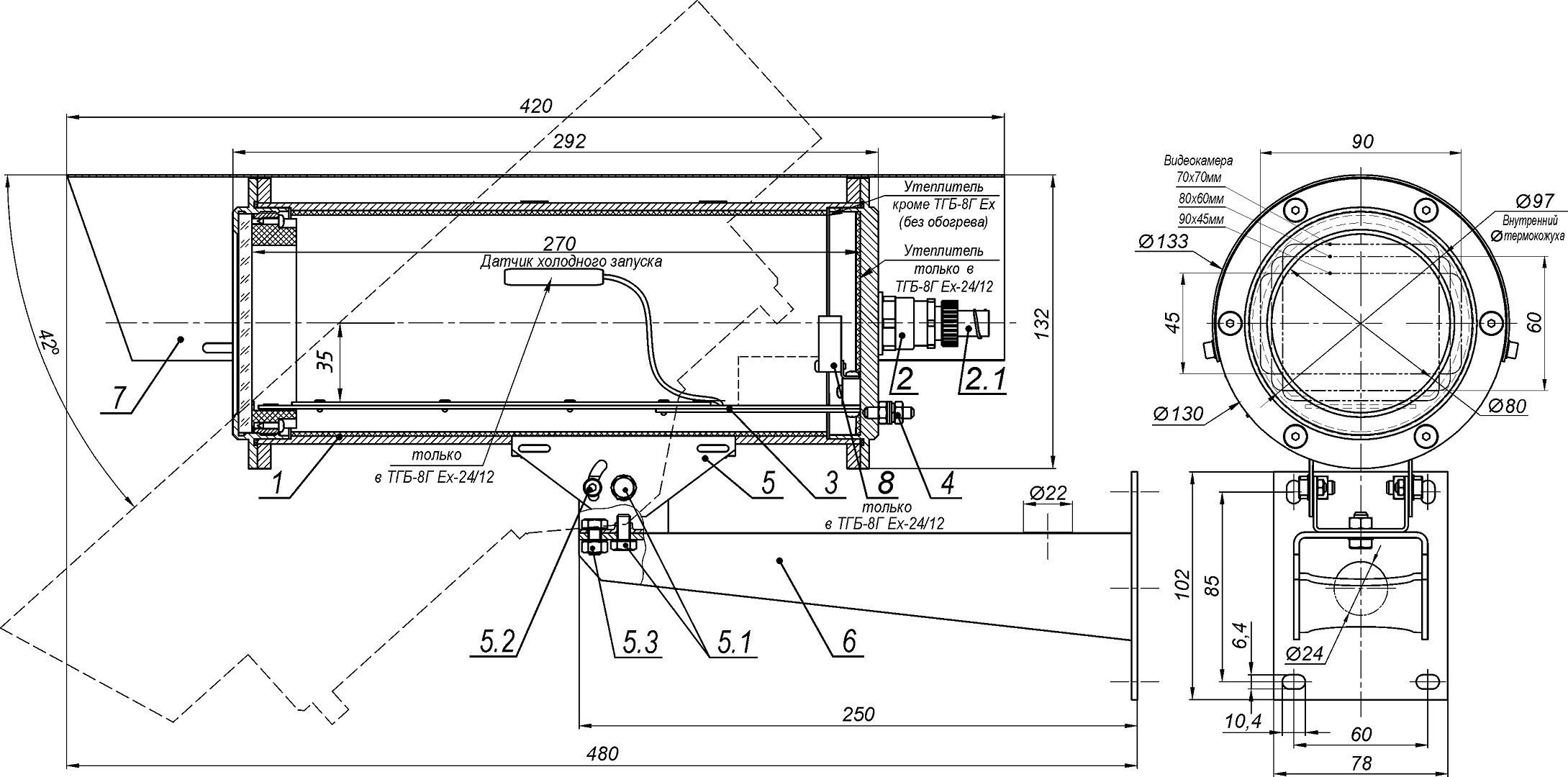 Класс взрывозащиты РВ Ех db I Mb X / 1Ех db IIC Т6 Gb Х / Ех tb IIIC Т80°C Db Х. Степень защиты IP66/IP68. Рабочий объем 70х70х270 мм. Габариты, мм: Lнар. 420, øнар. 133. Напряжение питания термокожуха 12V DC/AC. Напряжение питания видеокамеры 12VDC. Мощность обогрева 12/8 Вт. Диапазон рабочих температур -60° ÷ +50°C (с холодным пуском -25°С/-15°С ÷ +50°C). Максимальная потребляемая мощность (включая видеокамеру) 34/30 Вт. Два гермоввода под небронированный кабель диаметром 3,1-8,6мм с фиксатором металлорукава. В комплекте настенный кронштейн и солнцезащитный козырек.