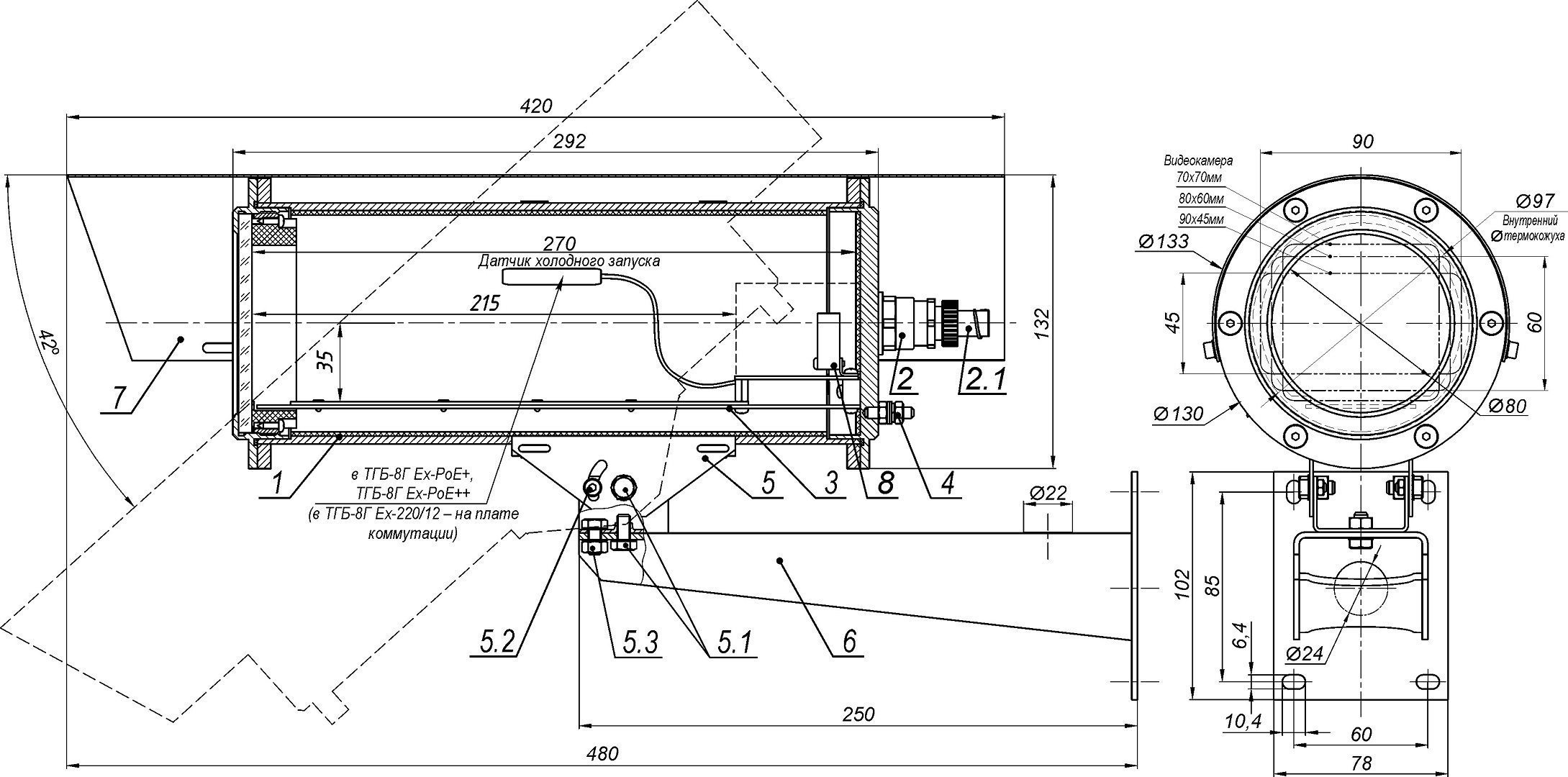 Класс взрывозащиты РВ Ех db I Mb X / 1Ех db IIC Т6 Gb Х / Ех tb IIIC Т80°C Db Х. Степень защиты IP66/IP68. Рабочий объем 70х70х215 мм. Габариты, мм: Lнар. 420, øнар. 133. Питание термокожуха по стандартам: IEEE 802.3bt (PoE++), PoH, UPOE (60Вт), Passive PoE 48…56V (60Вт). Питание видеокамеры по стандартам: IEEE 802.3af (PoE), IEEE 802.3at (PoE+). Мощность обогрева до хол. запуска/после хол. запуска 22/15 Вт. Диапазон рабочих температур -60° ÷ +50°C. Холодный пуск. Максимальная потребляемая мощность (включая IP-видеокамеру) 51 Вт. Два гермоввода под небронированный кабель диаметром 3,1-8,6мм с фиксатором металлорукава. В комплекте настенный кронштейн и солнцезащитный козырек.