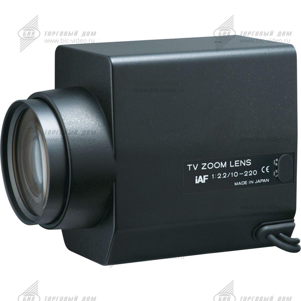 Трансфокатор TM22Z1022GAIPN-iAF с автофокусом предлагает фокусное расстояние 10-220 мм, что означает увеличение оптического изображения в 22 раза. Имеет потенциометры предустановок на фокус и фокусное расстояние. Размер матрицы 1/2". Тип управления диафрагмой DC. Крепление C-mount.