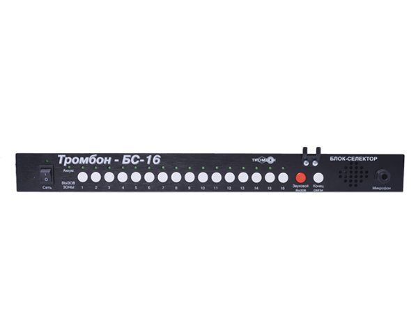 Блок-селектор Тромбон БС-16 устанавливается на посту диспетчерской и предназначен для организации двухсторонней речевой связи с вызывными панелями Тромбон-ВП, расположенными в зонах пожарного оповещения. К блоку-селектора возможно подключить до 16 линий связи с зонами оповещения, к каждой линии связи возможно подключить до 2-х вызывных панелей.