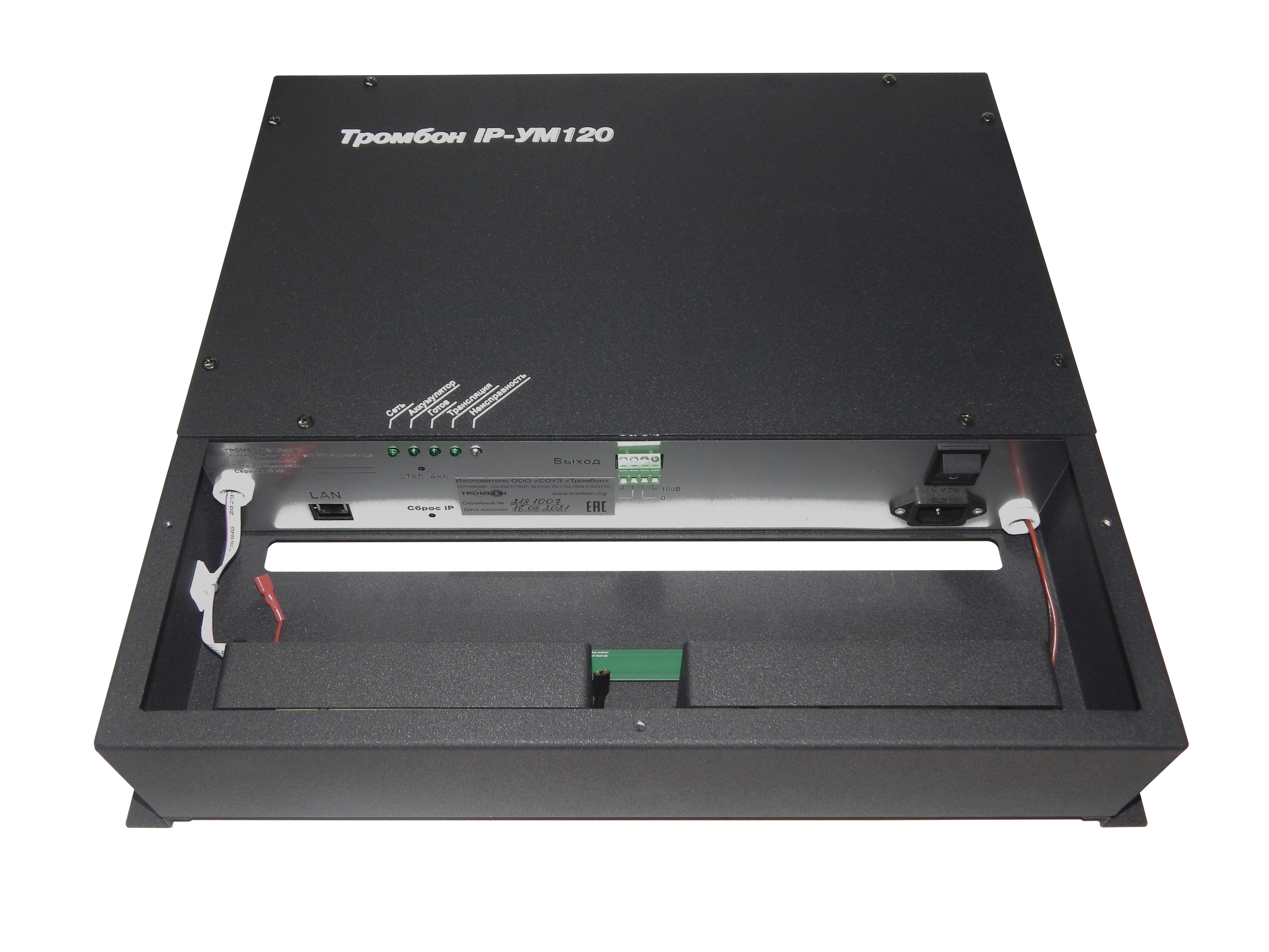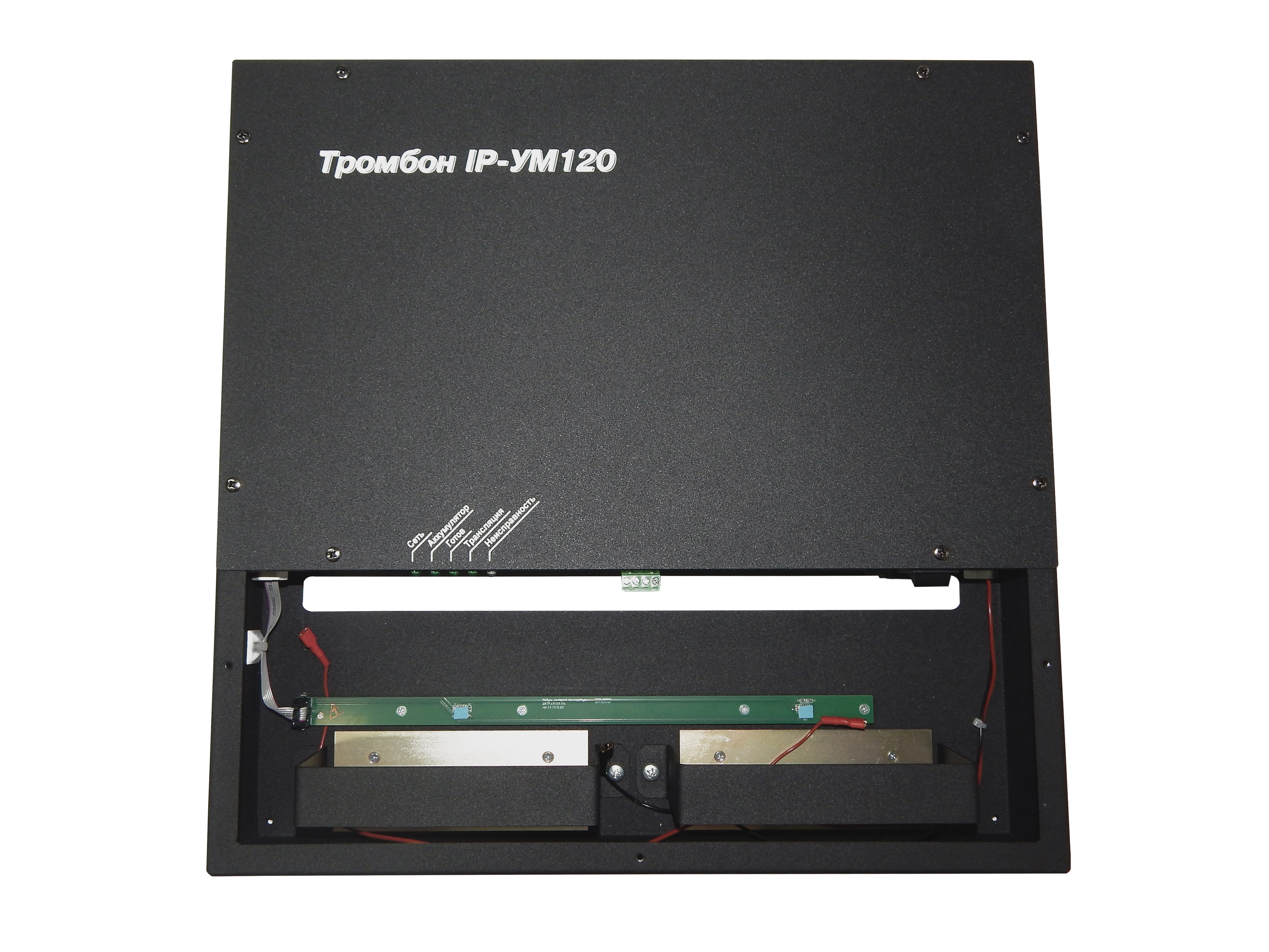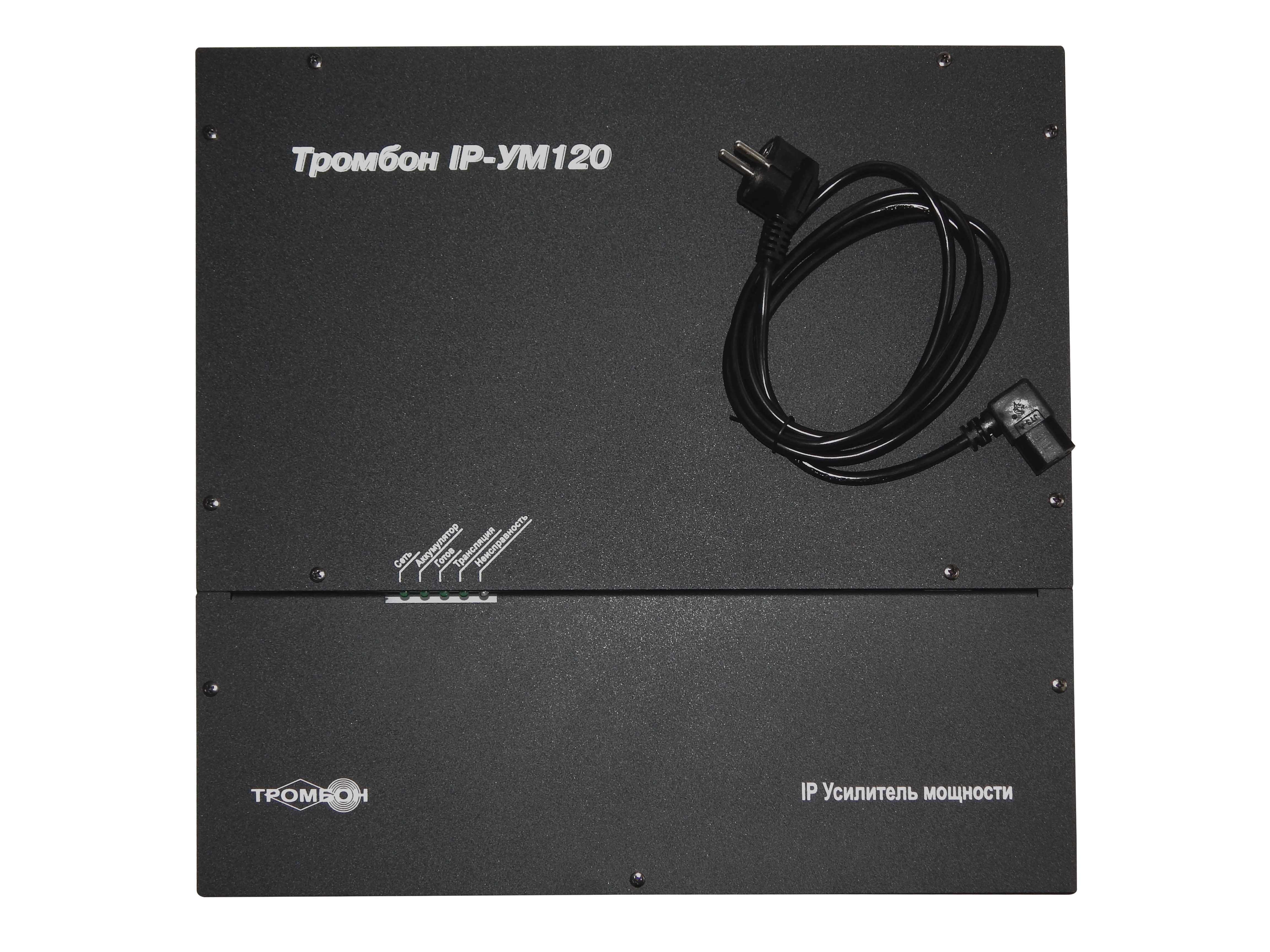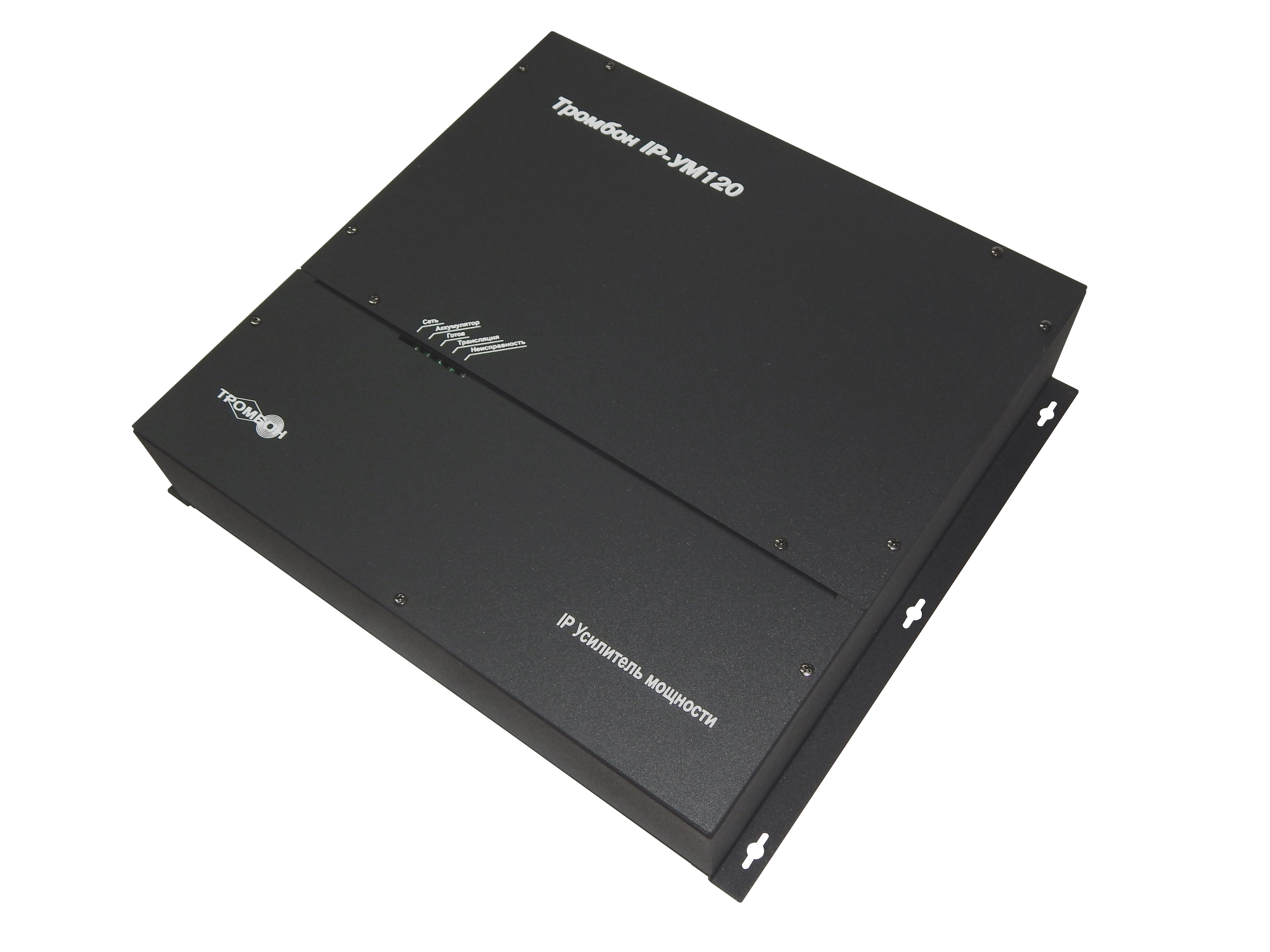 Усилитель мощности «Тромбон IP-УМ120» предназначен для приема управляющих сигналов и звуковых аудио-потоков от пультов звукового вещания и других источников авторизованных в системе. С помощью бортового ЦАП переводит сигнал в аналоговый формат, усиливает его, передает в линию связи с динамиками. Имеет встроенную защиту по питанию.
