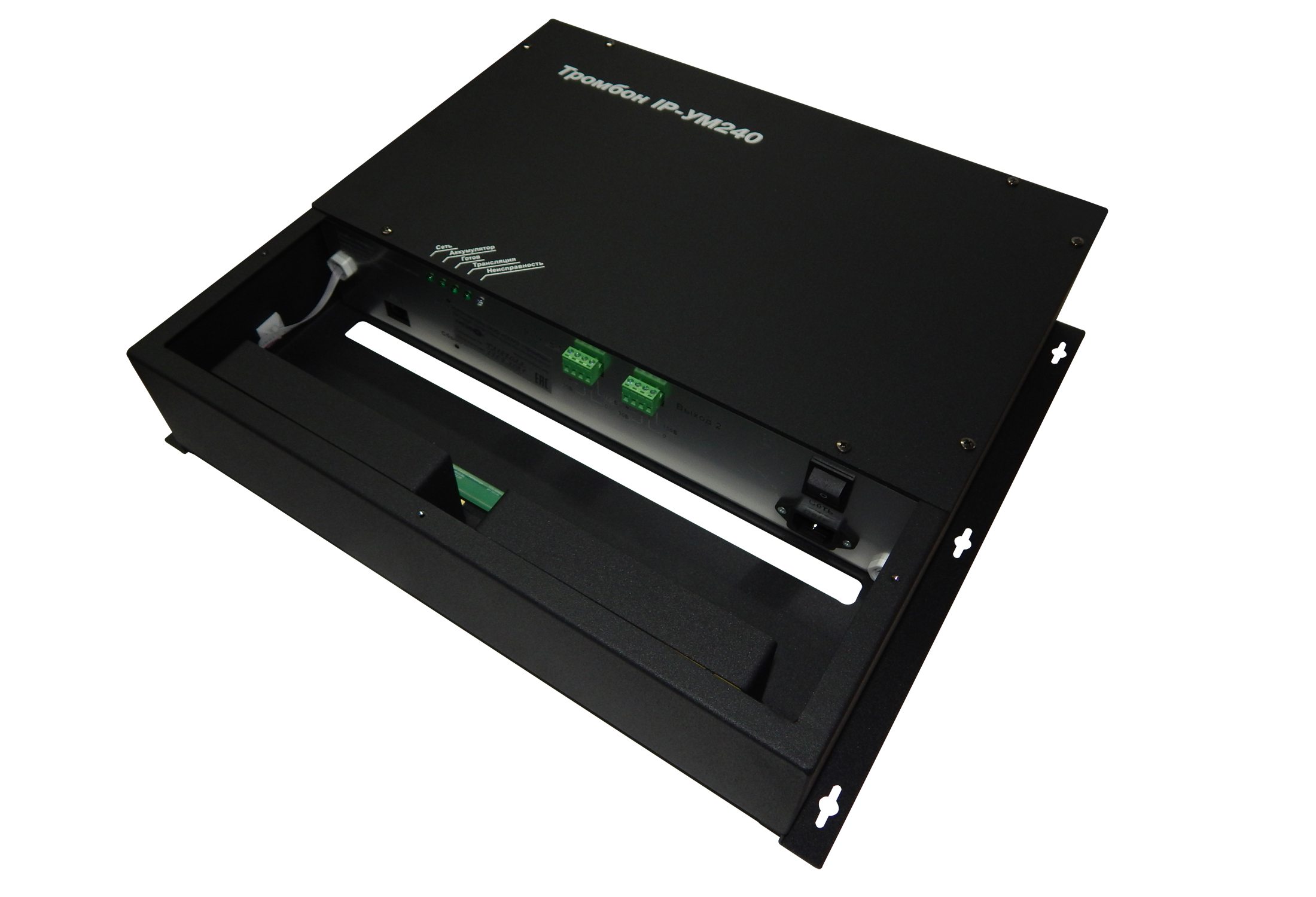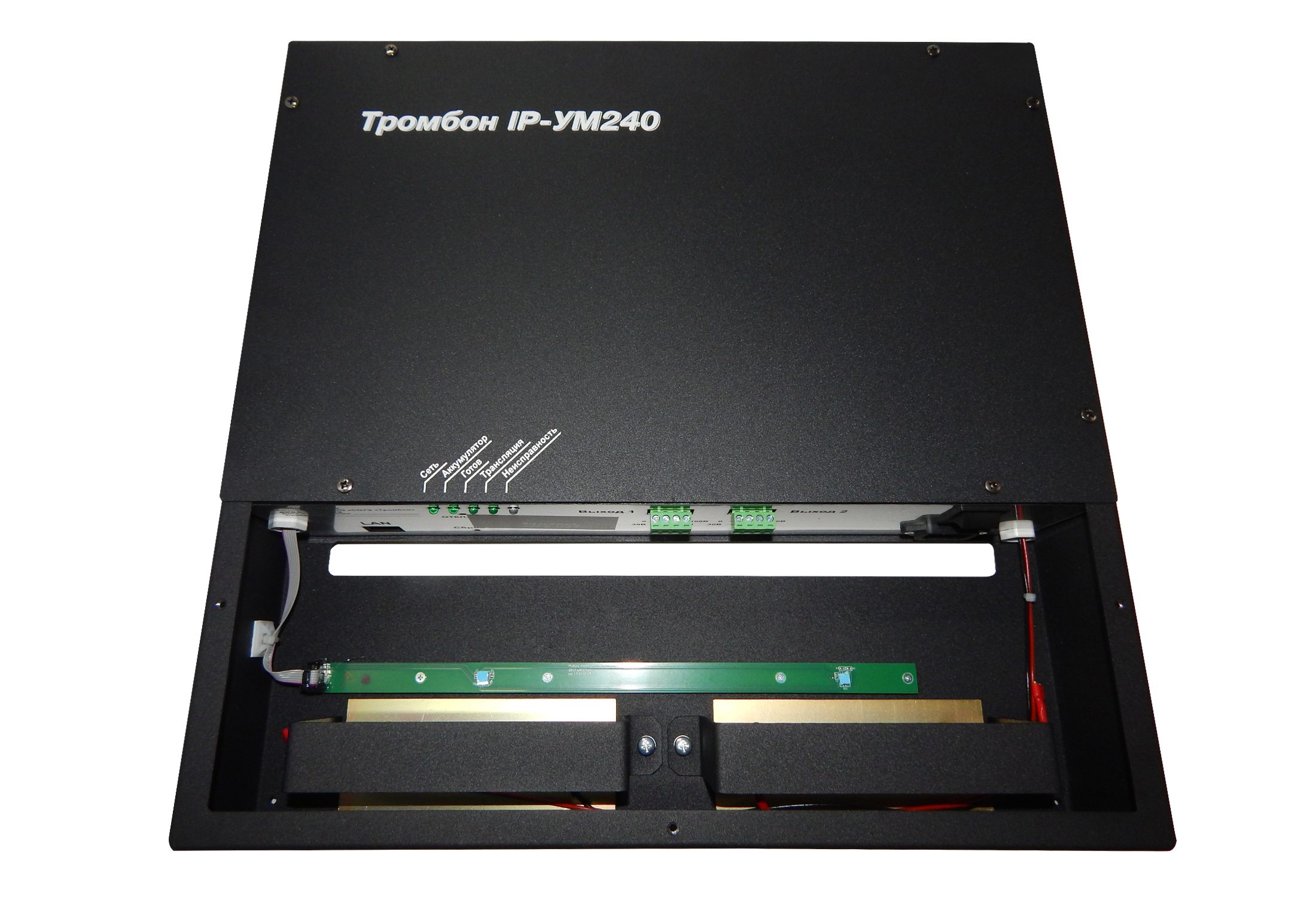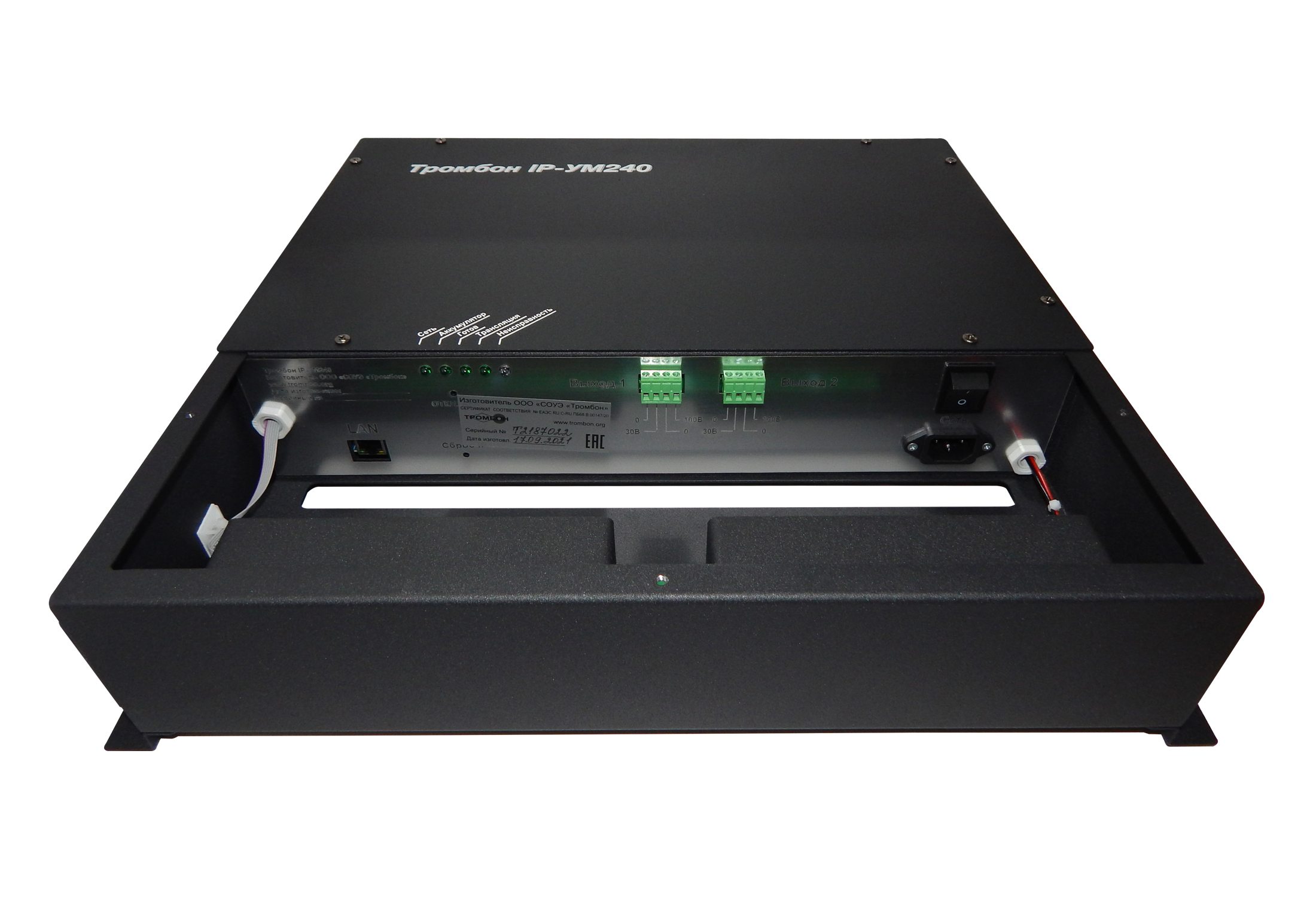 Усилитель мощности «Тромбон IP-УМ240» предназначен для работы в составе системы звукового вещания оповещения «Тромбон IP». Усилитель мощности предназначен для приёма голосовых, звуковых, тревожных и иных сообщений от Пультов Звукового Вещания «Тромбон IP-ПЗВ», модулей Оповещения и прочих устройств управления; приёма цифрового звукового контента, декодирования и воспроизведения на оконечные устройства — громкоговорители. А так же контроль линий связи, в случае использования в составе систем СОУЭ и/или прочих систем требующих обязательного контроля. Усилитель мощности оснащён системой резервного питания.