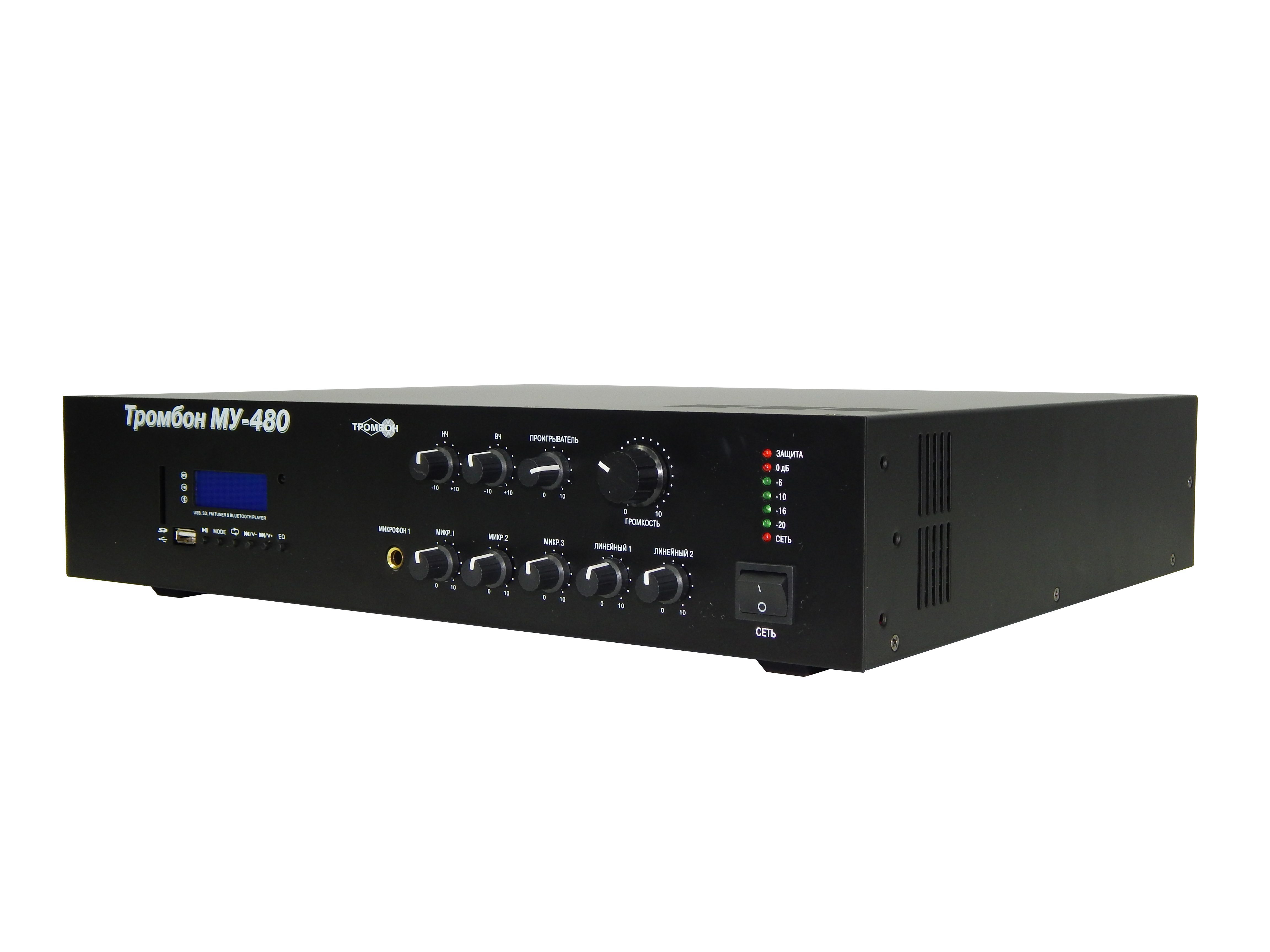 Трансляционные микшер-усилители Тромбон МУ используются для построения систем оповещения и музыкальной трансляции на базе дополнительного оборудования. Усилители предназначены для микширования и усиления звукового сигнала и его дальнейшей трансляции на громкоговорители. К микшеру-усилителю Тромбон МУ может быть подключено до 6-ти источников аудио сигнала: 3 микрофонных, 2 линейных входа и 1 вход АТС.. Уровни линейных и микрофонных входов регулируются при помощи ручек на передней панели. Имеет встроенный усилитель мощностью 480 Вт.Выбор и управление музыкальными источниками, осуществляется как с самого прибора, так и при помощи пульта дистанционного управления.