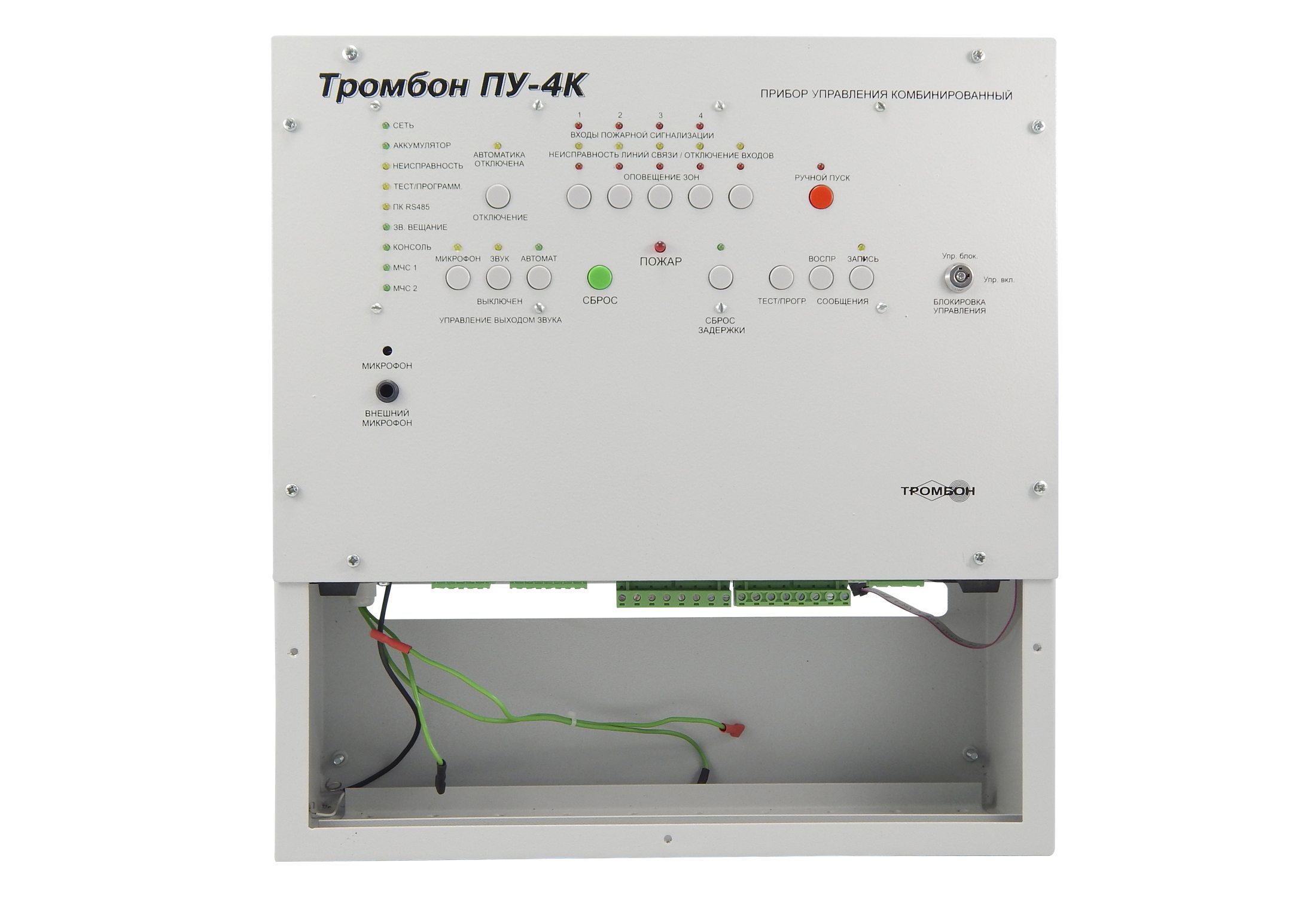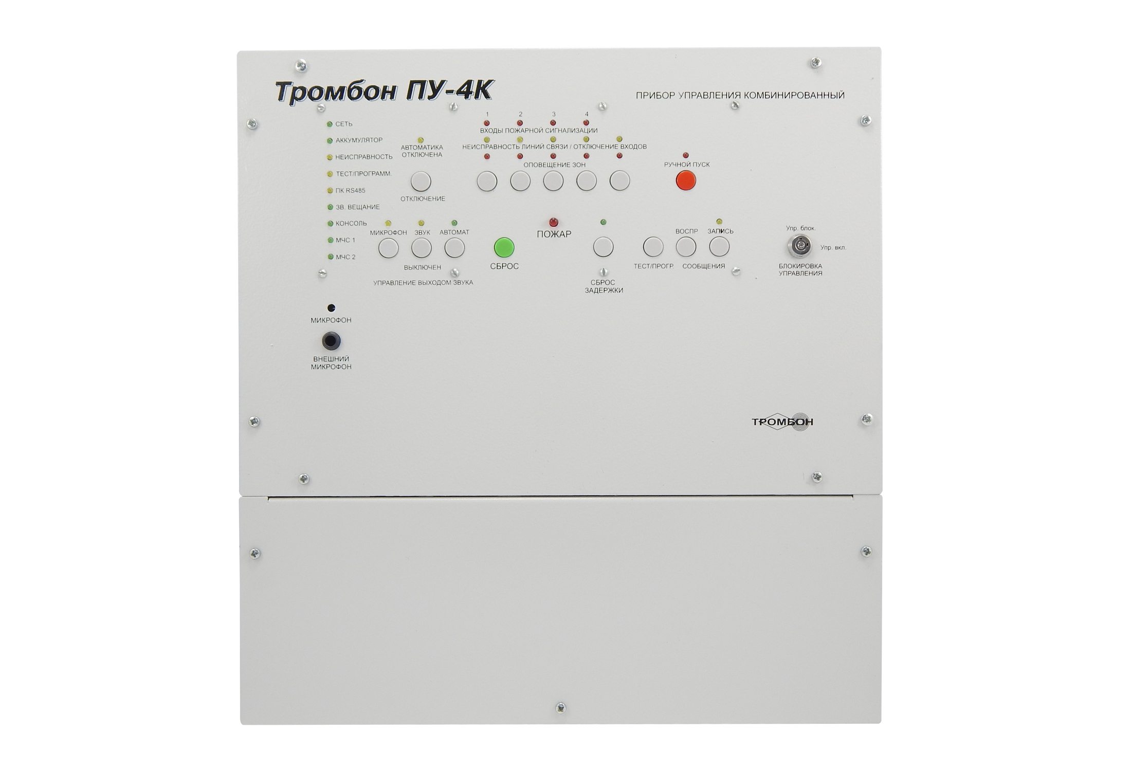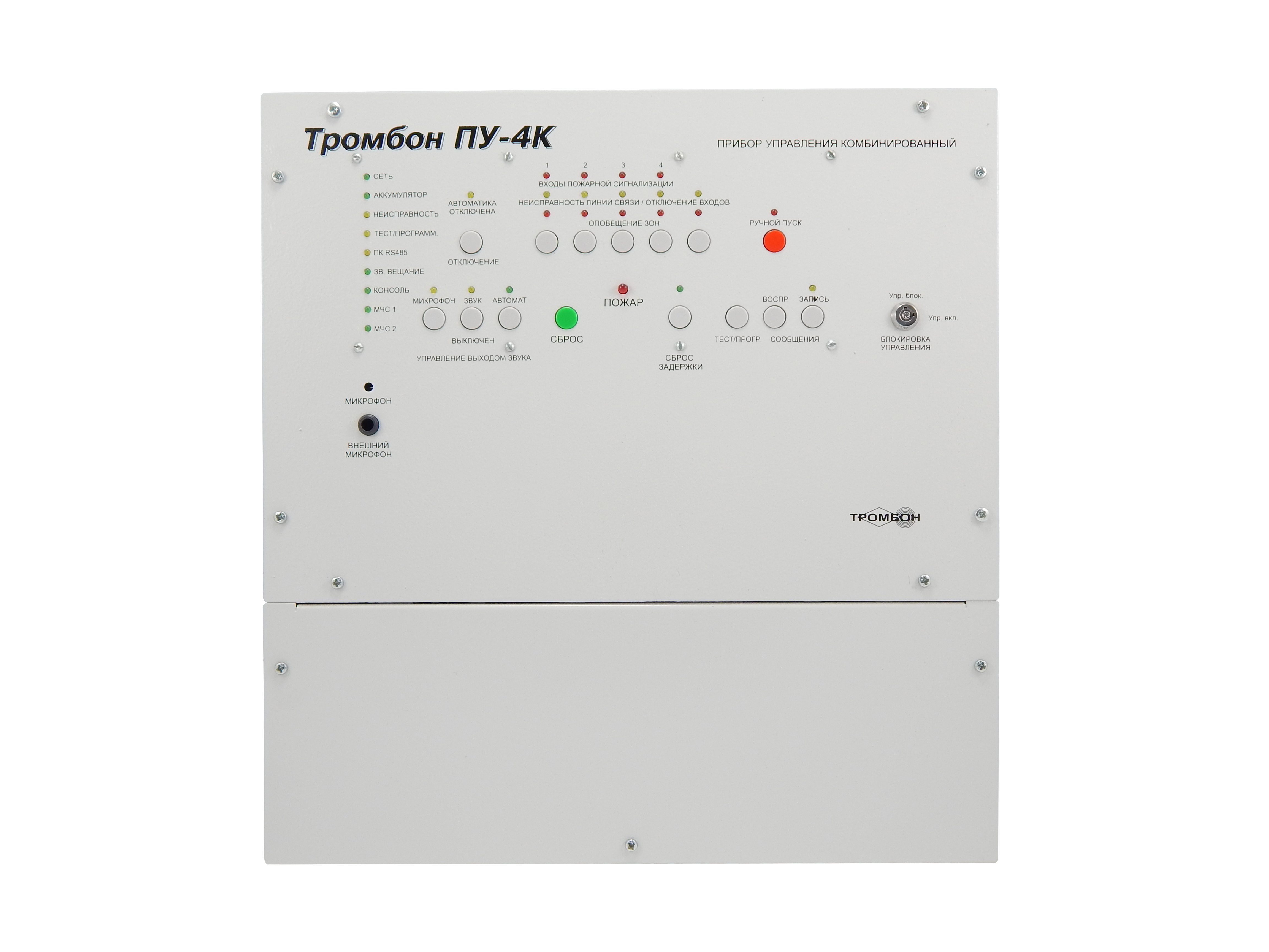 Приборы управления Тромбон ПУ-4К предназначен для построения системы оповещения и управления эвакуацией (СОУЭ) 3-го и 4-го типов. Оснащен встроенным усилителем мощности, системой резервного питания, двумя входами МЧС, гибкими настройками алгоритмов оповещения, интеллектуальной системой контроля всех линий связи, портом для подключения удаленных консолей Тромбон УК, интерфейсом RS-485 для подключения к ПК и сопряжения с системой безопасности АРМ "Орион Про".