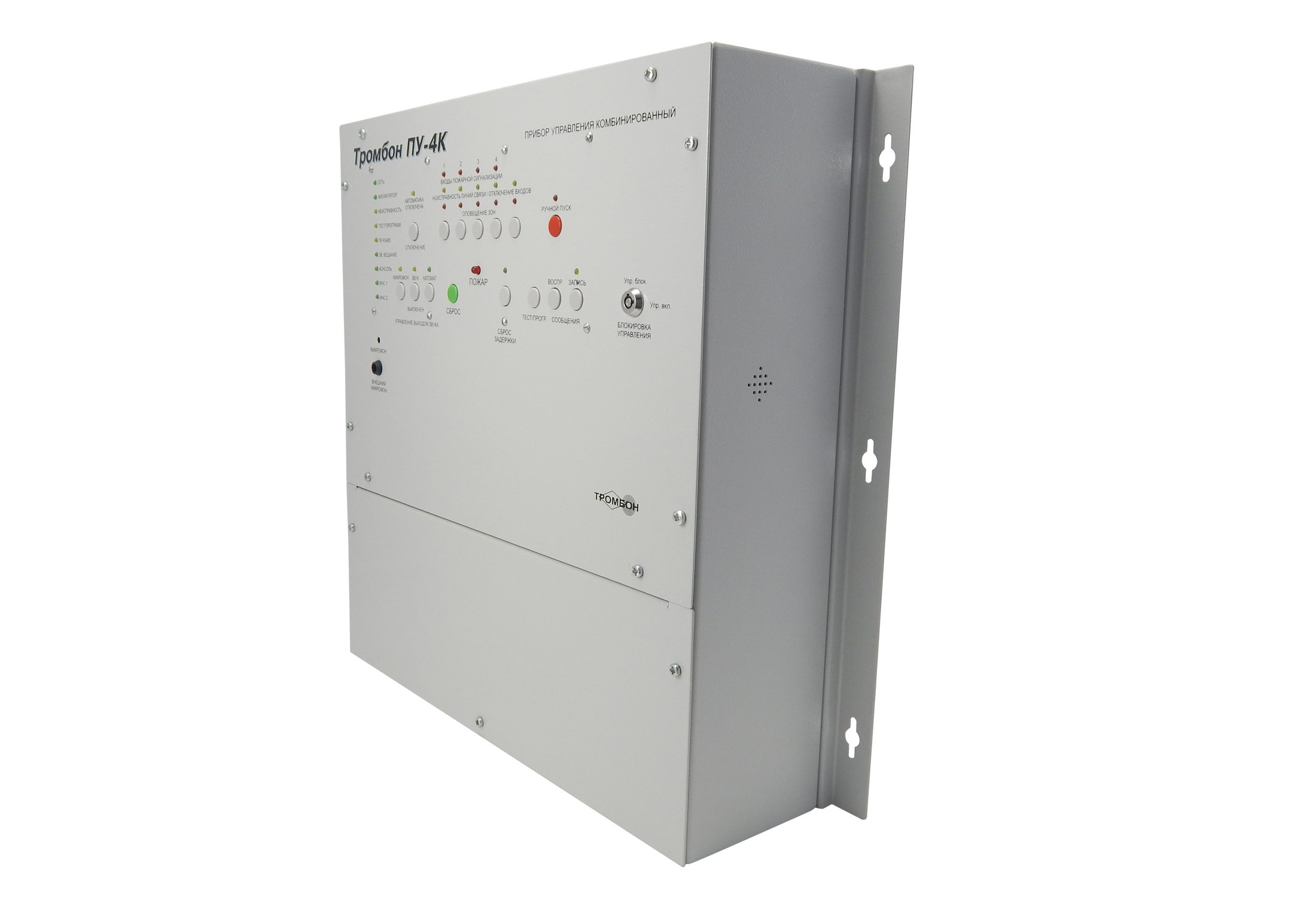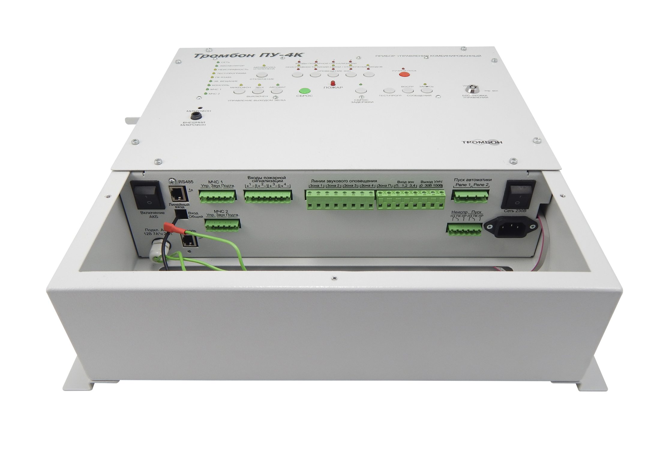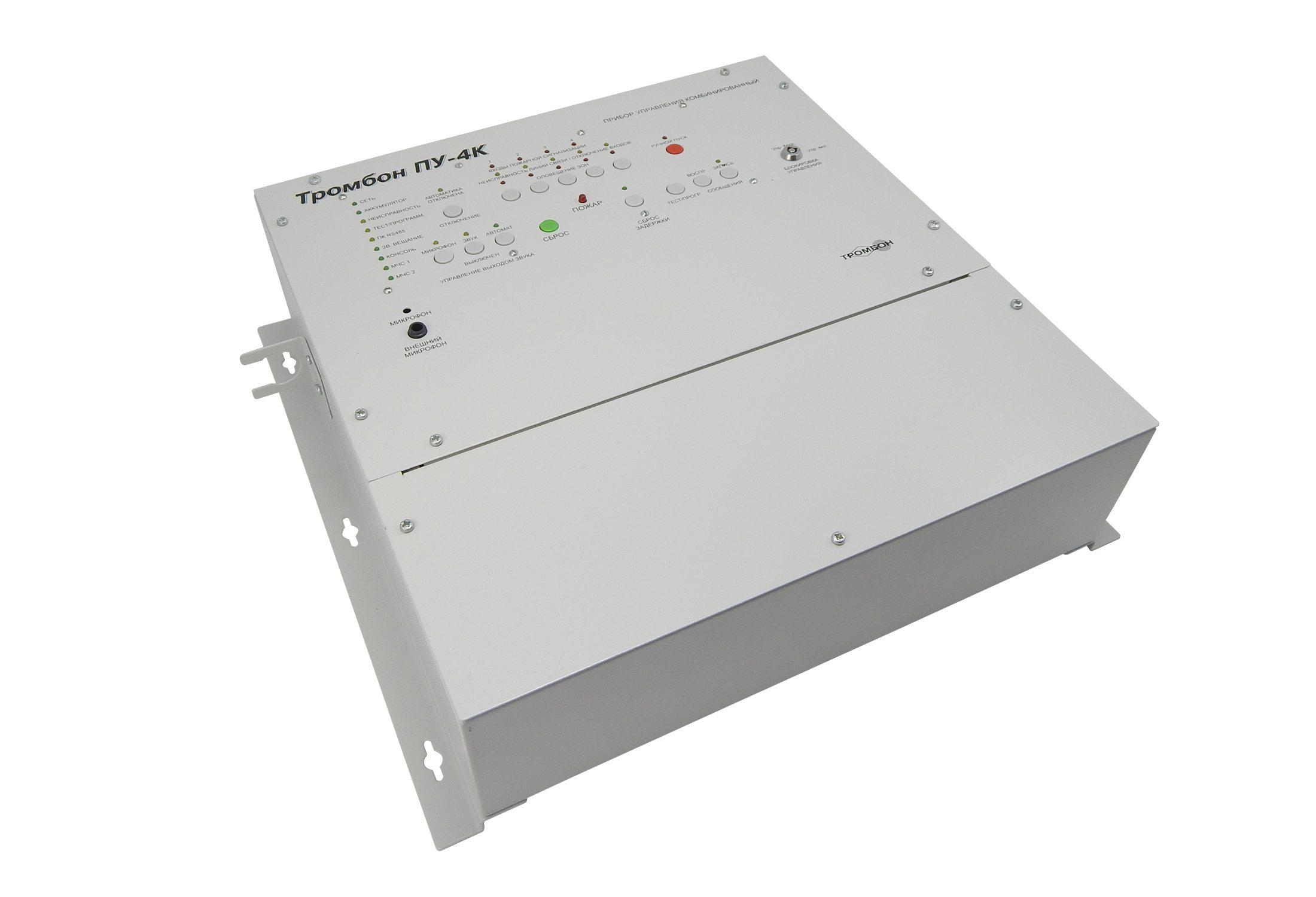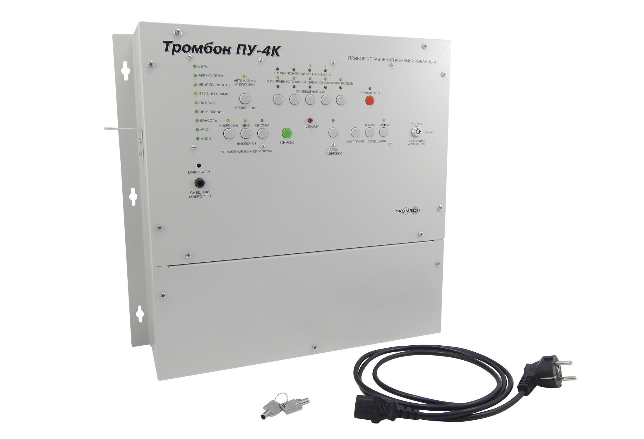 Приборы управления Тромбон ПУ-4К предназначен для построения системы оповещения и управления эвакуацией (СОУЭ) 3-го и 4-го типов. Оснащен встроенным усилителем мощности, системой резервного питания, двумя входами МЧС, гибкими настройками алгоритмов оповещения, интеллектуальной системой контроля всех линий связи, портом для подключения удаленных консолей Тромбон УК, интерфейсом RS-485 для подключения к ПК и сопряжения с системой безопасности АРМ "Орион Про".