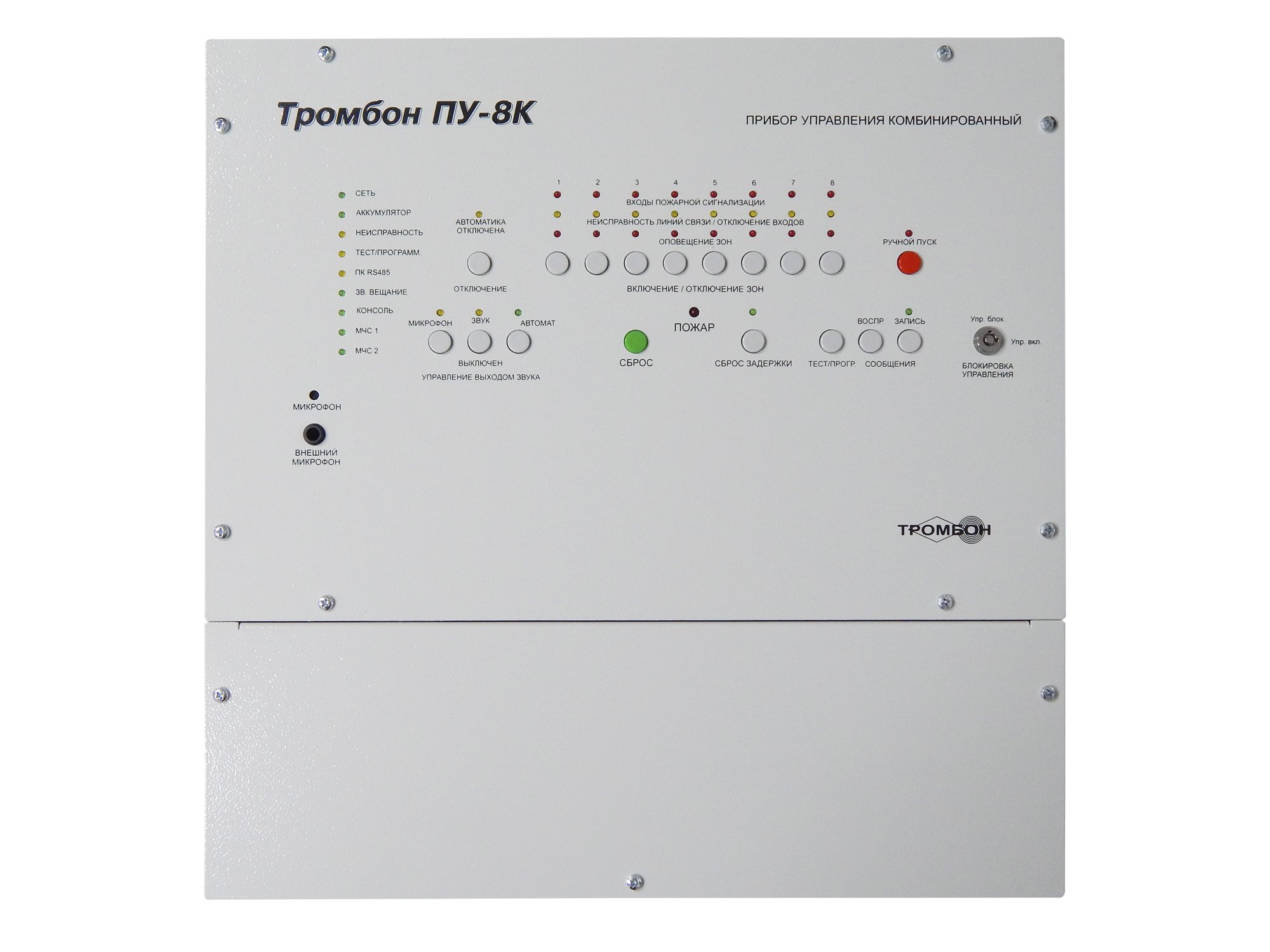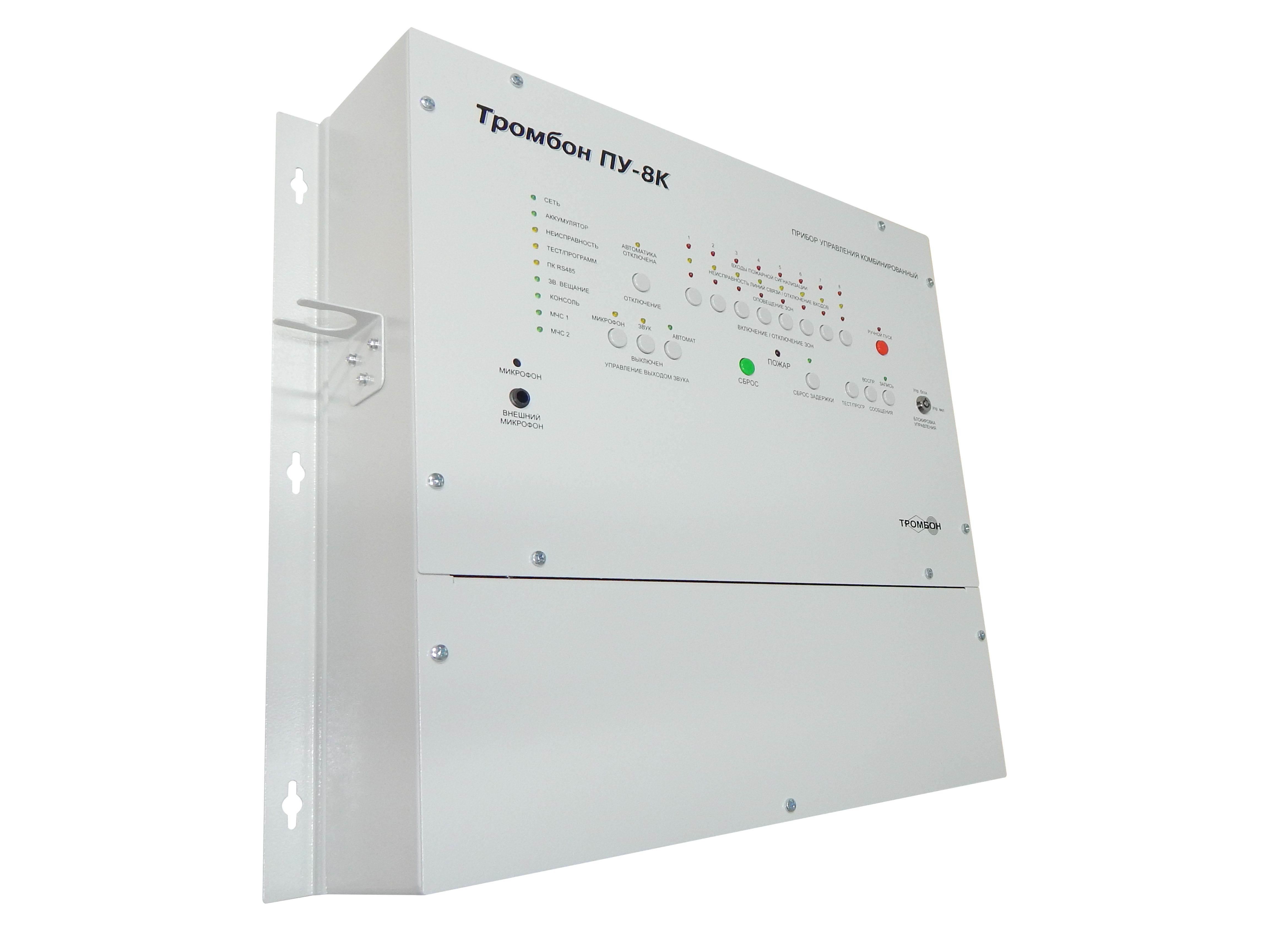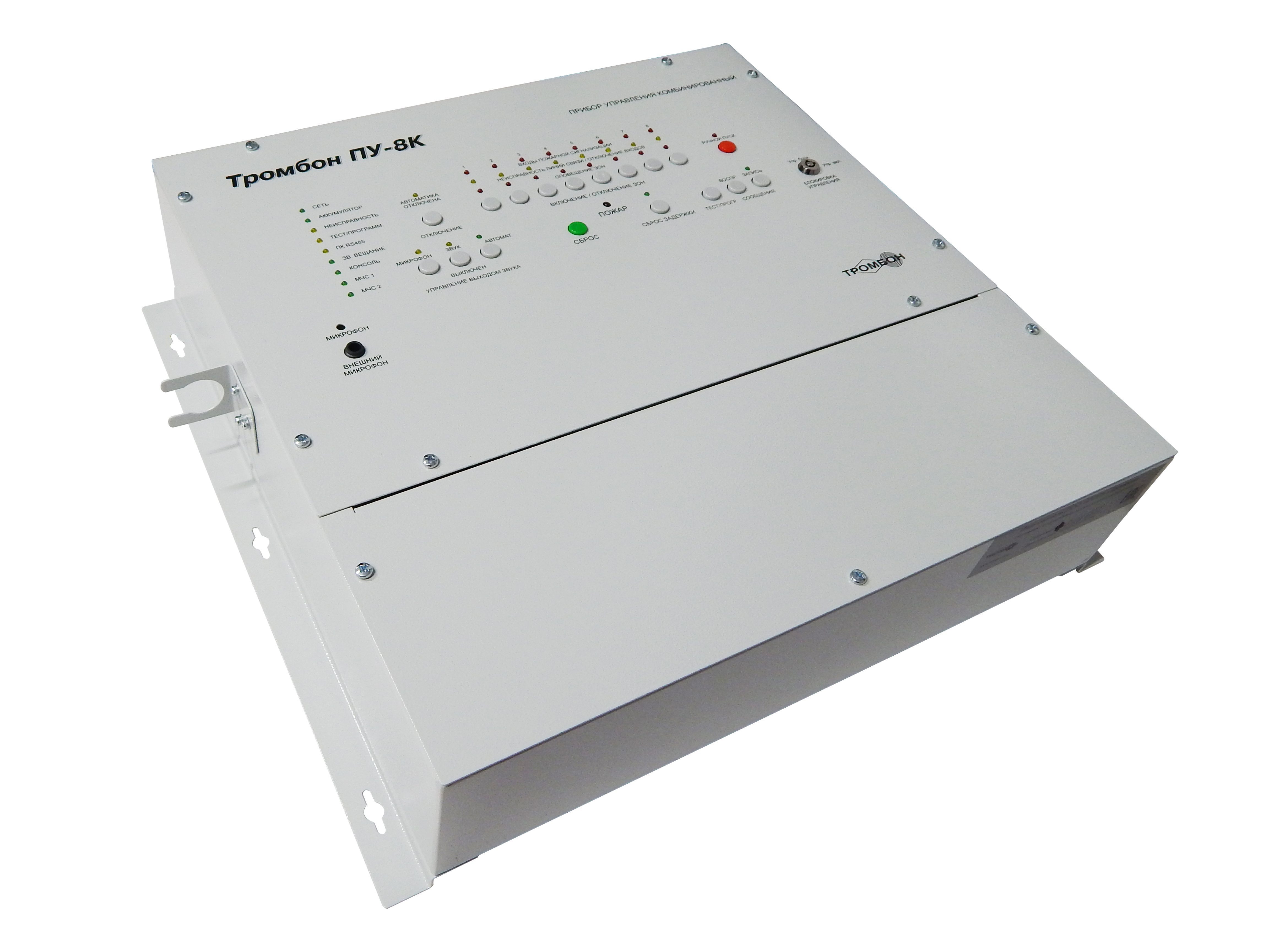 Прибор управления Тромбон ПУ-8К предназначен для построения системы оповещения и управления эвакуацией (СОУЭ) 3 – го и 4 – го типов.
