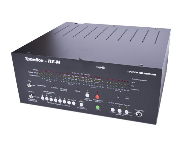Многозонный прибор управления техническими средствами оповещения и эвакуацией для СОУЭ 3, 4 и 5 типов; зон светового и звукового оповещения - 32; напряжение питания 220В 50Гц; встроенный блок резервного питания 12В; встроенный звуковой процессор на 8 речевых сообщений по 15сек.; порт для подключения до 8 удаленных консолей Тромбон УК; сопряжение с ПК (RS 485); сопряжения с системами безопасности Орион, Интеллект+ и GOAL; контроль линий связи; вход ГО и МЧС; габариты - 483х384х176 мм (4U); вес - не более 16кг
