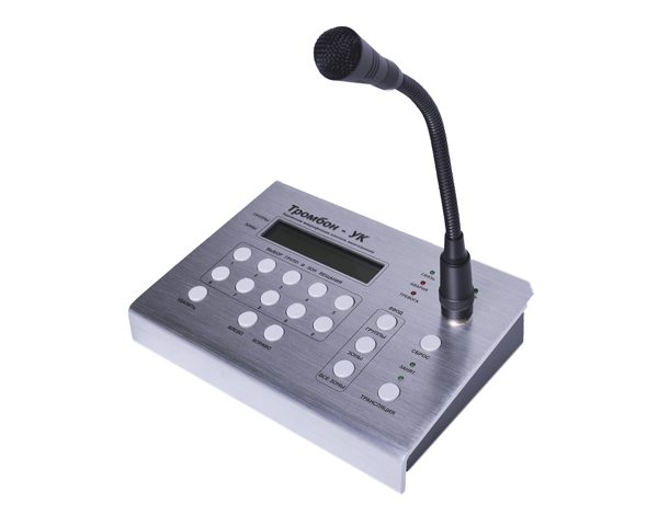 Удалённая консоль для дистанционного управления системой оповещения "Тромбон", количество коммутируемых зон вещания - 32; микрофонный вход - 1; встроенный микрофон - 1; потребляемая мощность - 5Вт; максимальное расстояние до прибора управления - 1200м, габариты - 200х145х45 мм, 0,9 кг. Работает совместно с приборами «Тромбон ПУ-М-хх» «Тромбон ПУ-4» «Тромбон ПУ-8»