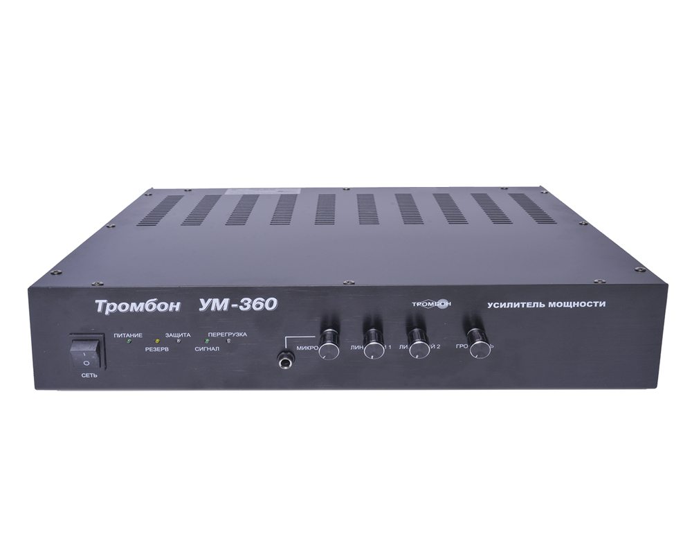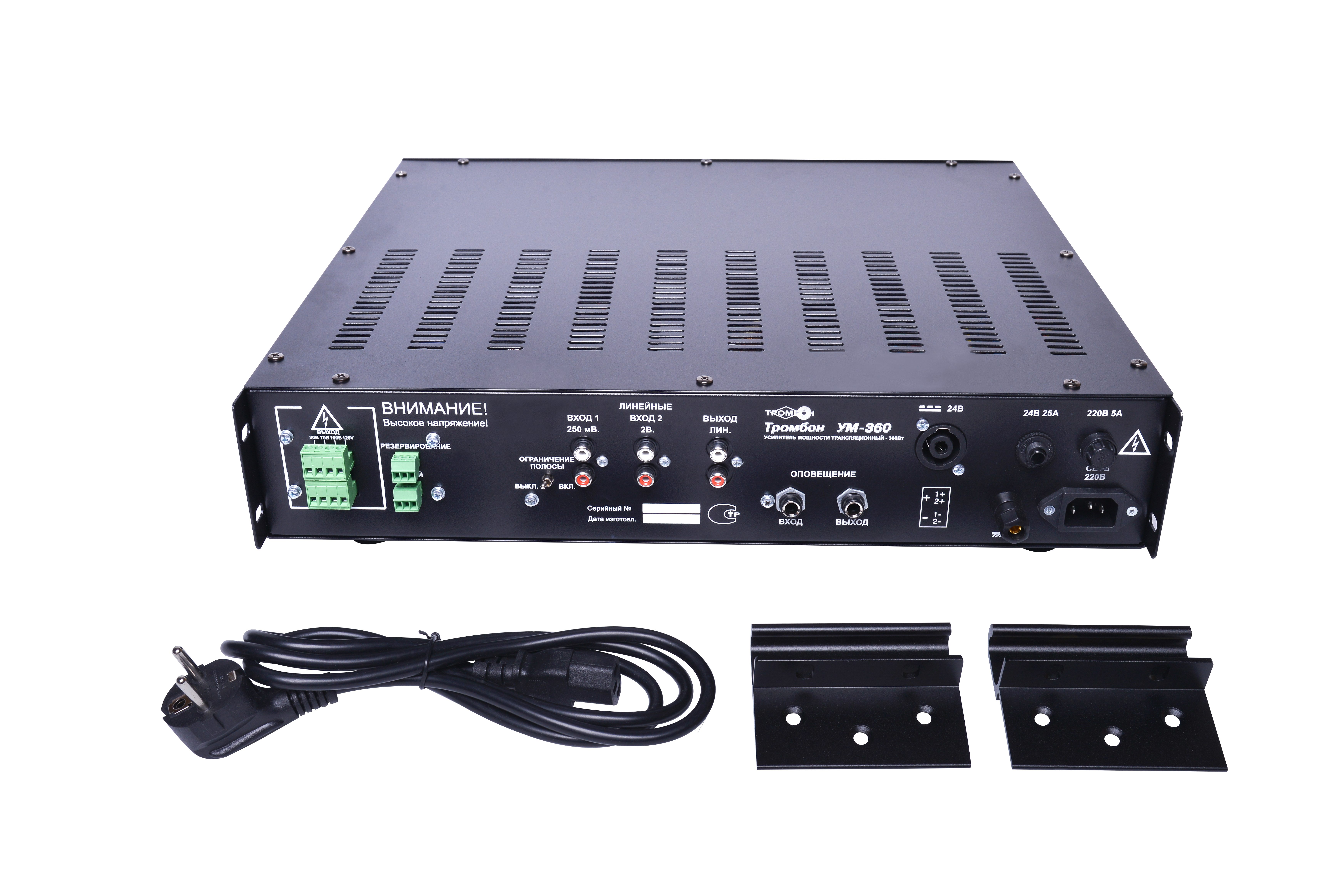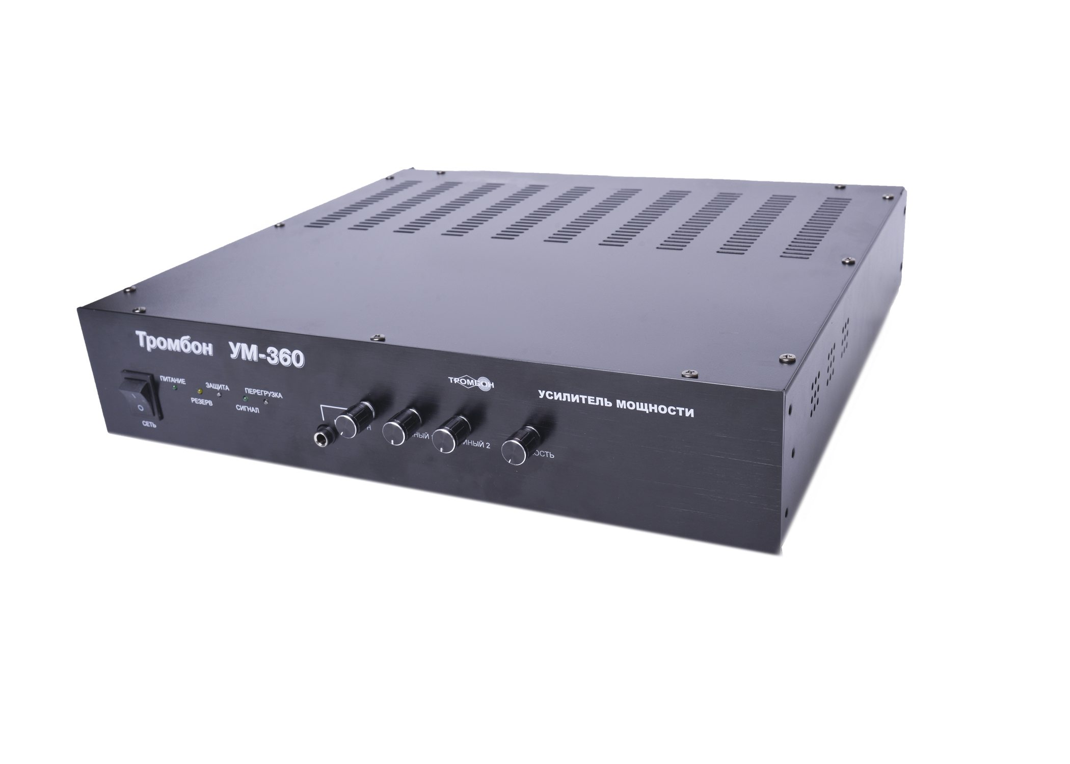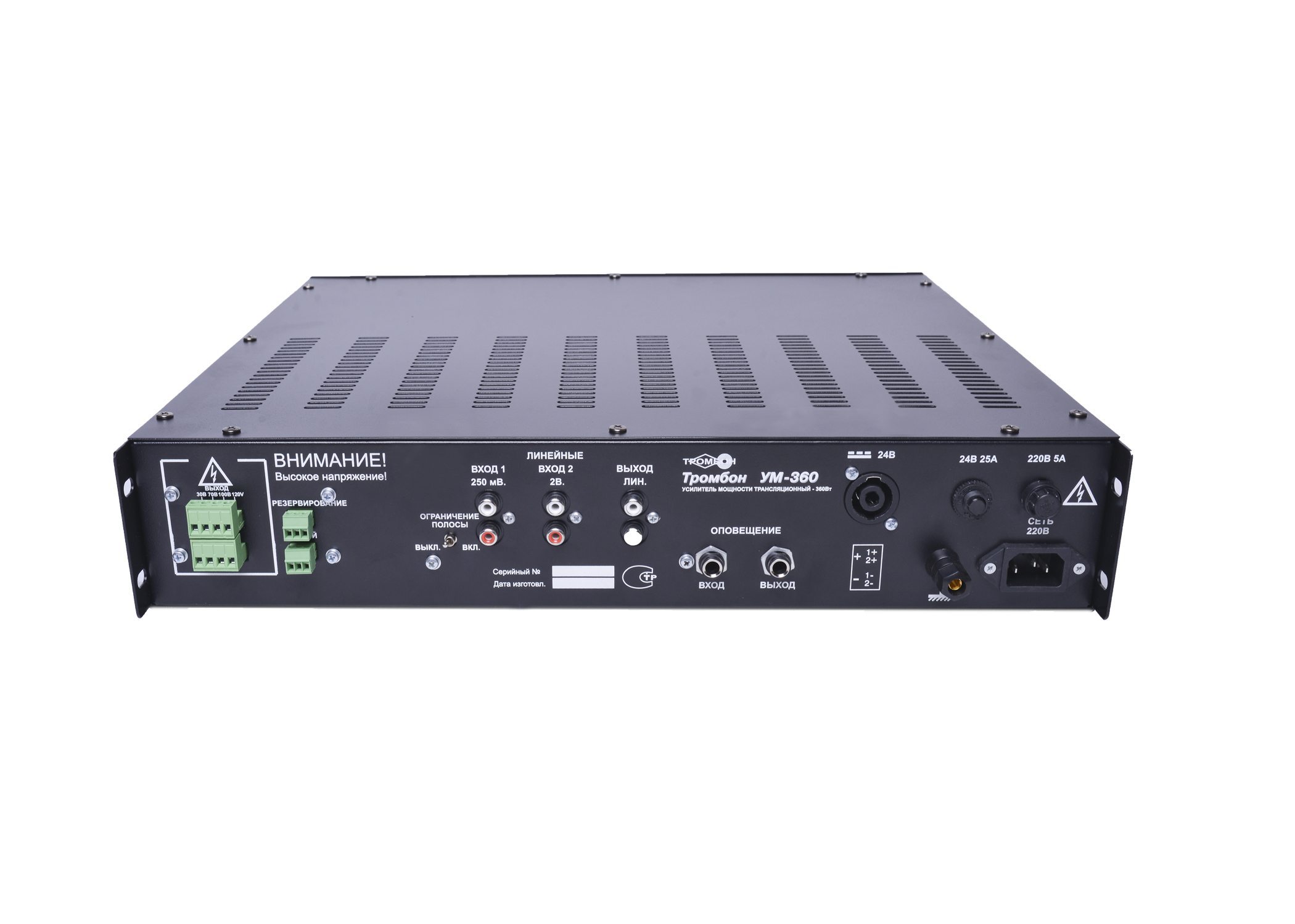 Усилитель средней мощности, основное питание от сети - ~220В, резервное питание от источника постоянного тока- =24В, номинальная выходная мощность - 360 Вт, входов - 4, выходное напряжение 30, 70, 100, 120 В, диапазон частот по микрофонному и линейным входам - 100-20000 Гц, по входу оповещения - 100 - 12500 Гц, габариты - 438х285х88 (2U) мм, 8кг. В качестве источников резервного питания рекомендуется блок резервного питания «Тромбон БП-21».