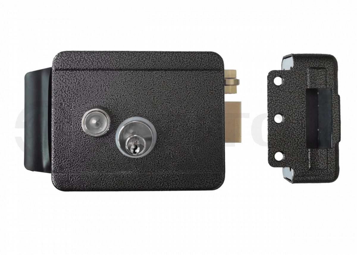Замок электромеханический накладной, универсальный. Блокировка кнопки в 2-х положениях. Питание: 12 В, 1,5 А. В комплекте 5 ключей. Рабочая температура: -40...+50°С. Материал корпуса: крашенная сталь.
