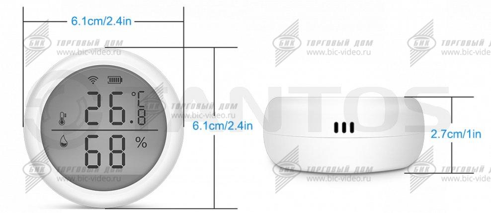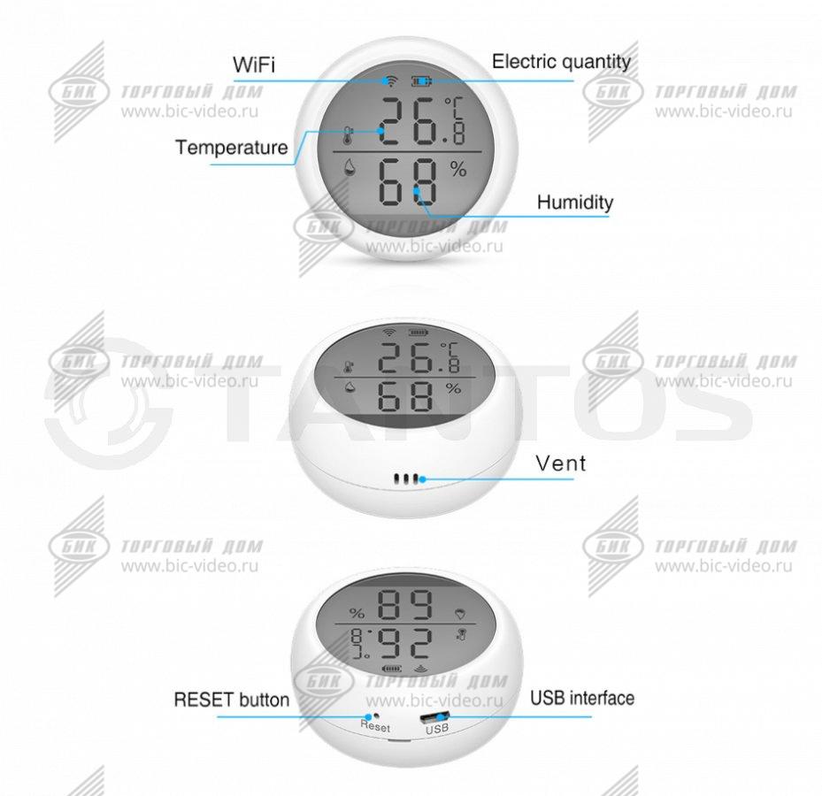 Wi-Fi датчик влажности и температуры с ЖК экраном и возможностью подключения через облачный сервис умного дома Tyua (Smart Life - Smart Living). Питание от батарей 2хААА или microUSB. Поддержка Wi-Fi 802.11b/g/n. Диапазон измерения температуры: 10-55 ℃. Диапазон измерения влажности:0-99%RH. Встроенный зуммер 55 дБ. Настенное крепление.