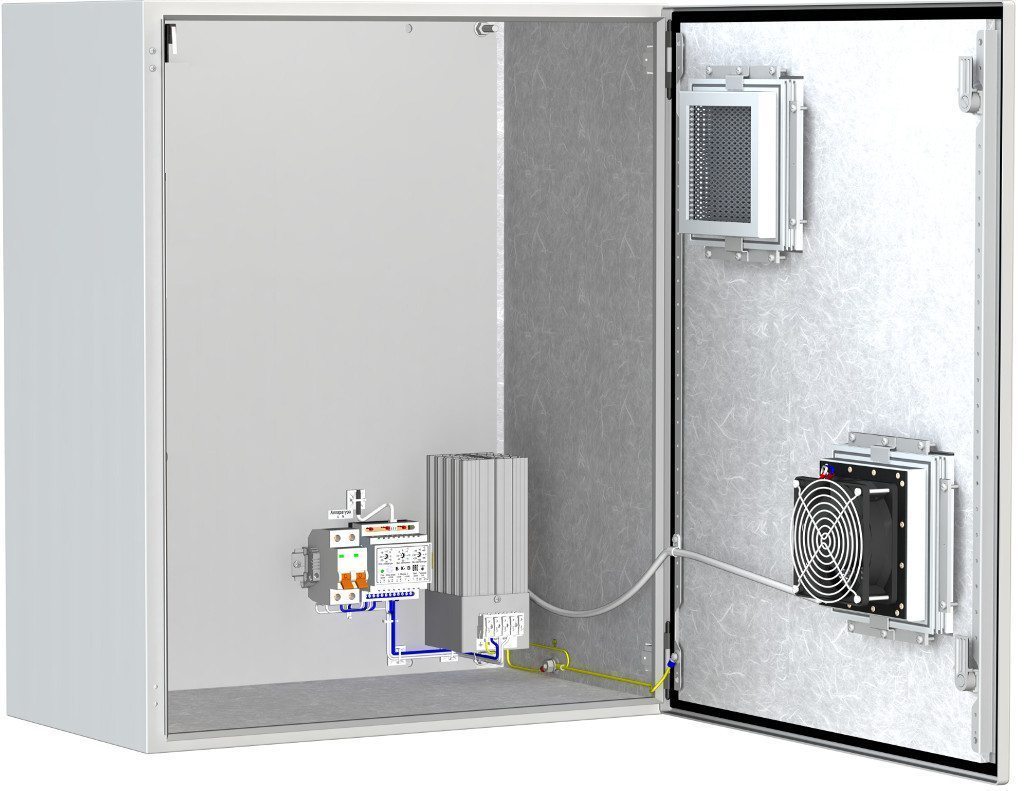 Термошкаф ТШ-12-В1 с обогревом и вентиляцией. Предназначен для установки в нем телевизионного, либо другого электронного оборудования и поддержания заданного температурного режима при эксплуатации этого оборудования. Термошкаф оборудован блоком управления климатом (БУК-5), предназначенным для управления системой обогрева; блоком управления климатом (БУК-5В), предназначенным для управления системой вентиляции; обогревателем термошкафов ОТШ-160, оборудованным встроенным биметаллическим выключателем, ограничивающим температуру поверхности радиатора до +90°С; вентиляторной системой охлаждения и тамперным контактом для сигнализации о несанкционированном доступе. Степень защиты корпуса IP55.