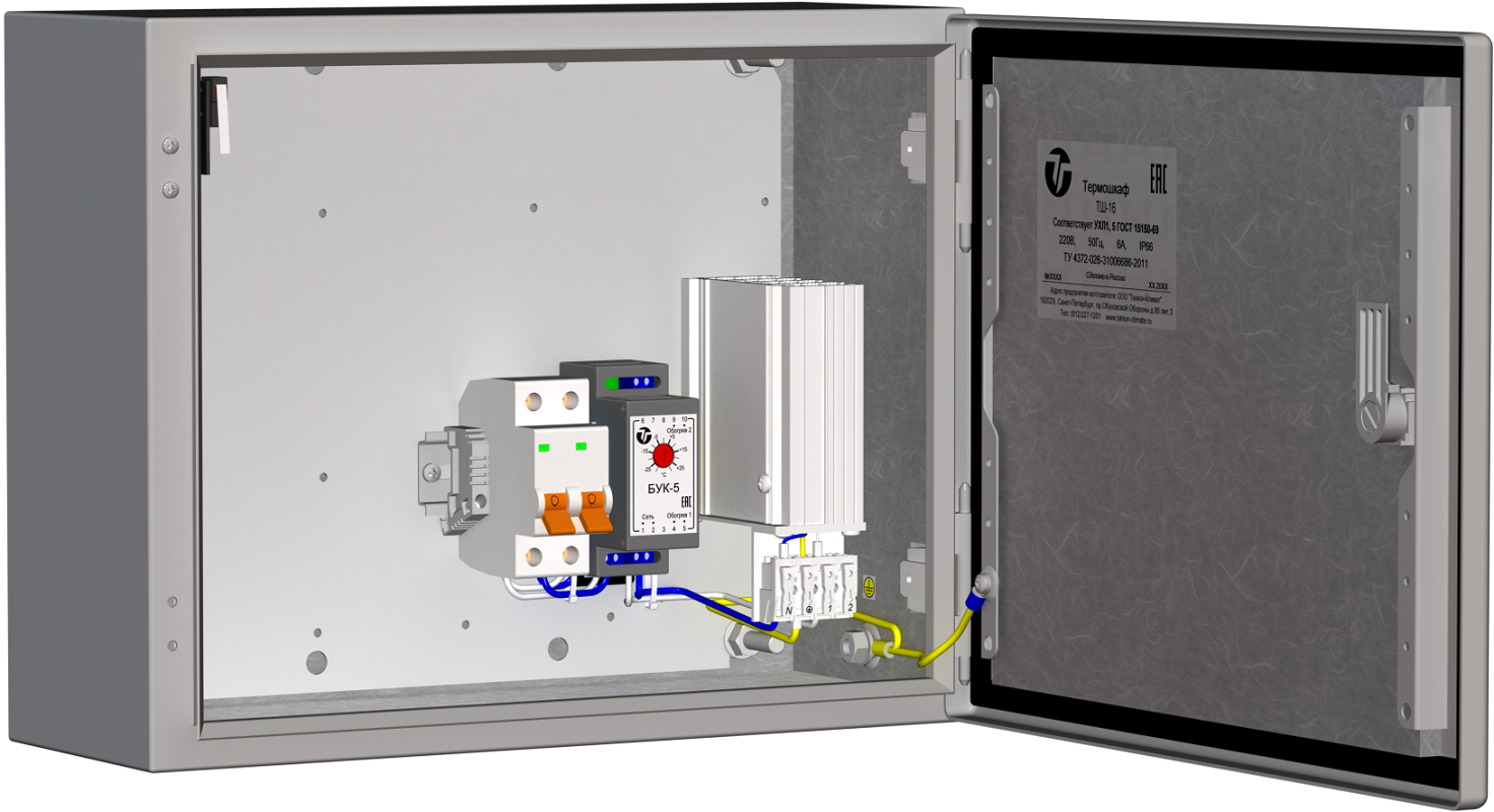 Термошкаф оборудован блоком управления климатом (БУК-5), предназначенным для управления системой обогрева; обогревателем термошкафов ОТШ-40, оборудованным встроенным биметаллическим выключателем, ограничивающим температуру поверхности радиатора до 90°С и тамперным контактом для сигнализации о несанкционированном доступе. Степень защиты корпуса IP66.