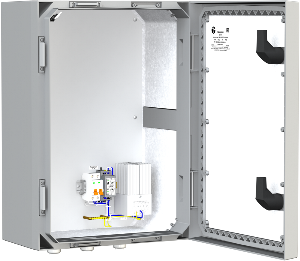 - обогревателем термошкафов ОТШ-160, оборудованным встроенным биметаллическим выключателем, ограничивающим температуру поверхности радиатора до +90°С;
