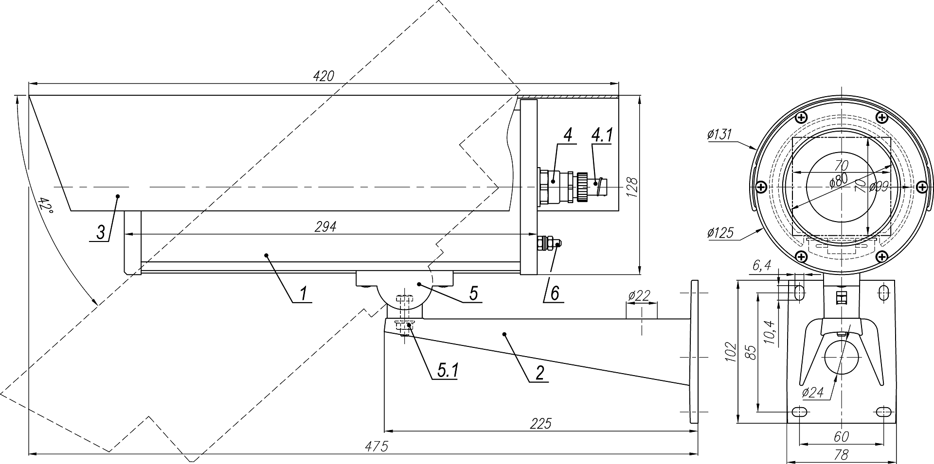 Видеокамера в термокожухе ТГБ-4Г Ex IIC. Класс взрывозащиты 1Ex db IIC T6 Gb X / Ex tb IIIC T80°C Db X. Степень защиты IP66/IP68. Рабочий объем 70х70х215 мм. Габариты, мм: Lнар. 420, øнар. 131. Напряжение питания термокожуха 24V DC/AC. Напряжение питания видеокамеры 12VDC. Мощность обогрева 25/17 Вт. Диапазон рабочих температур -60°С/-40°С ÷ +50°C. Холодный пуск. Максимальная потребляемая мощность 45/37 Вт. В комплекте настенный кронштейн, солнцезащитный козырёк. Камера LTV-3CNS40, разрешение 2688×1520 (4 Мр); чувствительность 0.0005 лк (цвет, F1.2, АРУ вкл.)0.0001 лк (ч/б, F1.2, АРУ вкл.); объектив 2,8-12 мм.