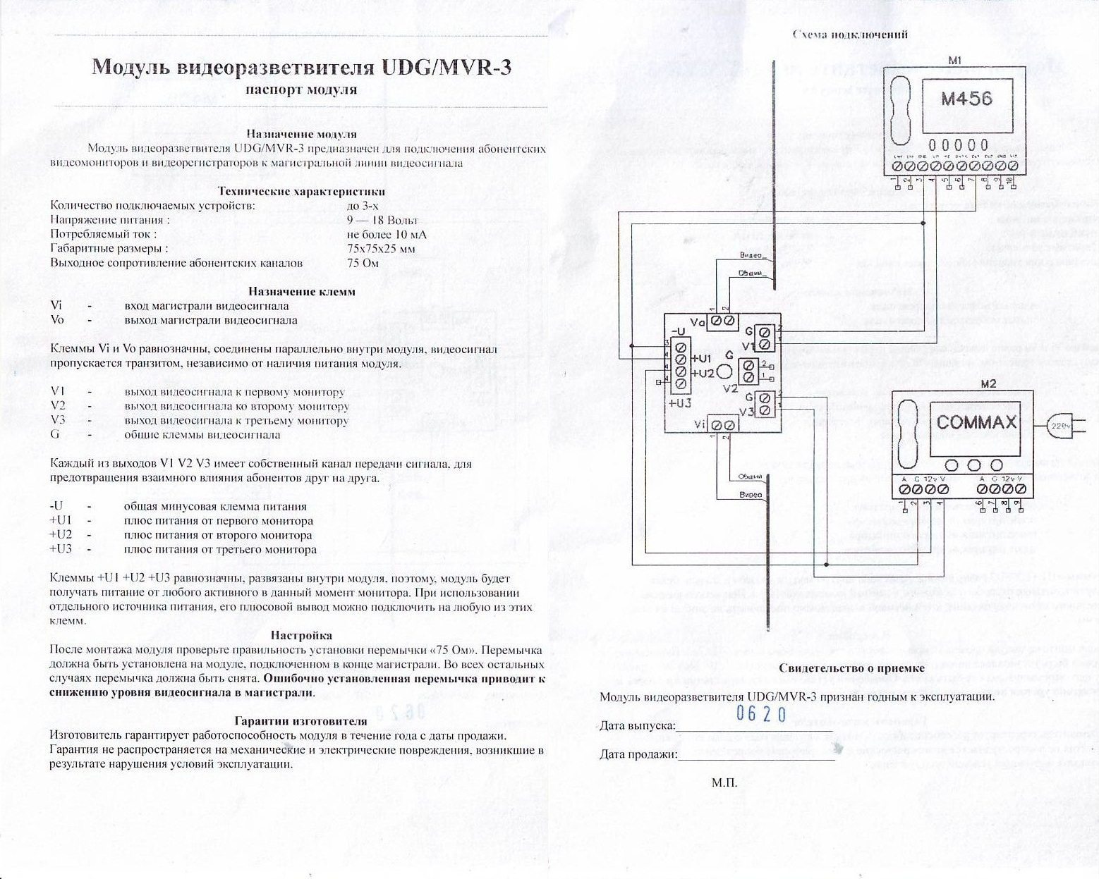 UDG/MVR-3 - Модуль видеоразветвителя, предназначен для подключения абонентских видеомониторов и видеорегистраторов к магистральной линии видеосигнала. Возможно подключение до 3-х абонентских устройств. Потребляемый ток не более 10 мА. Выходное сопротивление абонентских каналов 75 Ом.