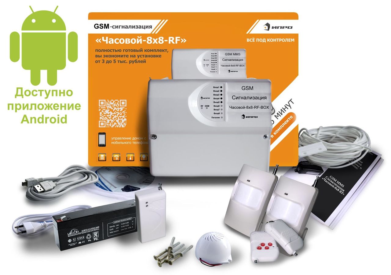 GSM сигнализация Умный часовой 8х8-RF BOX комплект ПРОФИ радио (радиоканальный комплект для дома ПРОФИ). При покупке комплекта вы приобретаете уже полностью готовое решение. Комплект рассчитан на установку в обычной квартире, загородном доме или на даче. Комплект содержит следующее оборудование: 2 беспроводной датчик движения, 1 магнитно-контактный датчик (устанавливается на дверь или окно), 2 радиобрелка, аккумулятор, сирена, термодатчик, разъемы и крепеж.