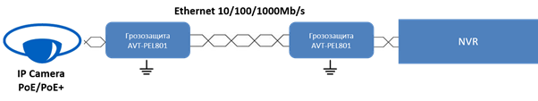 Устройство AVT-PEL801 предназначено для защиты линий Ethernet 10BASE-T, 100BASE-TX, 1000BASE-T с поддержкой PoE/PoE+ (IEEE 802.3af/at, схемы А и B), в частности защиты портов сетевых коммутаторов, видеорегистраторов, IP-камер, WI-FI маршрутизаторов от импульсных перенапряжений, вызванных грозовыми разрядами, ударами молний, высоковольтными импульсными наводками, электростатическими разрядами, помехами коммутации и т.п;