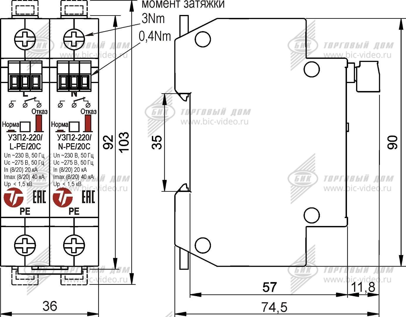 Степень защиты IP20 в соответствии с ГОСТ 14254. Конструктивно УЗП2-220К/LN-PE/20С выполнено в корпусе из трудногорючего пластика с креплением на 35мм DIN-рейку.