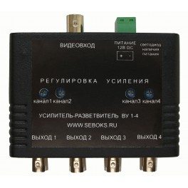 ВУ-1/4 - усилитель-разветвитель видеосигнала в пластмассовом корпусе. На днище корпуса расположены подстроечные резисторы. 1вход - 4выхода, I – 60 мА. Питание 12 В. Размеры корпуса 90х64х35 мм.