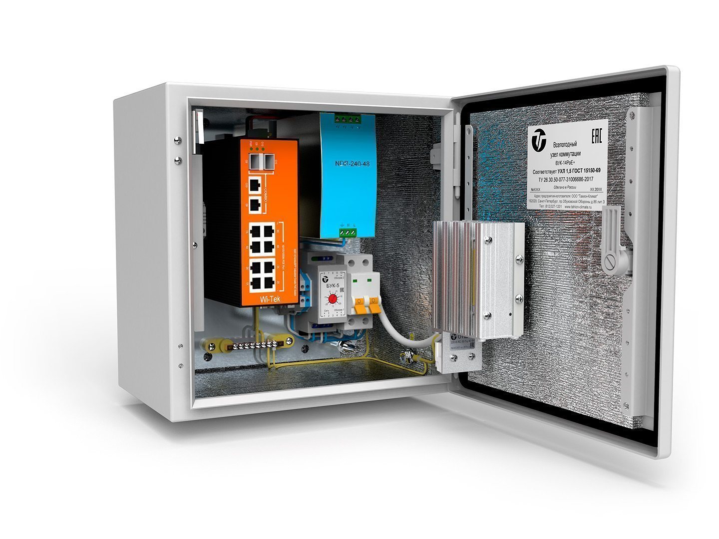 Всепогодный узел коммутации ВУК-18-PoE+ предназначен для обеспечения работы от 1 до 8 IP-видеокамер с питанием по технологии РоЕ/PoE+, организации группового канала передачи данных по волоконно-оптической сети, а также поддержания заданного температурного режима при эксплуатации задействованного оборудования. Комплектуется: блоком управления климатом (БУК-5), предназначенным для управления обогревом; обогревателем термошкафов ОТШ-40, оборудованным встроенным биметаллическим выключателем, ограничивающим температуру поверхности радиатора до +90°С и тамперным контактом для сигнализации о несанкционированном доступе.