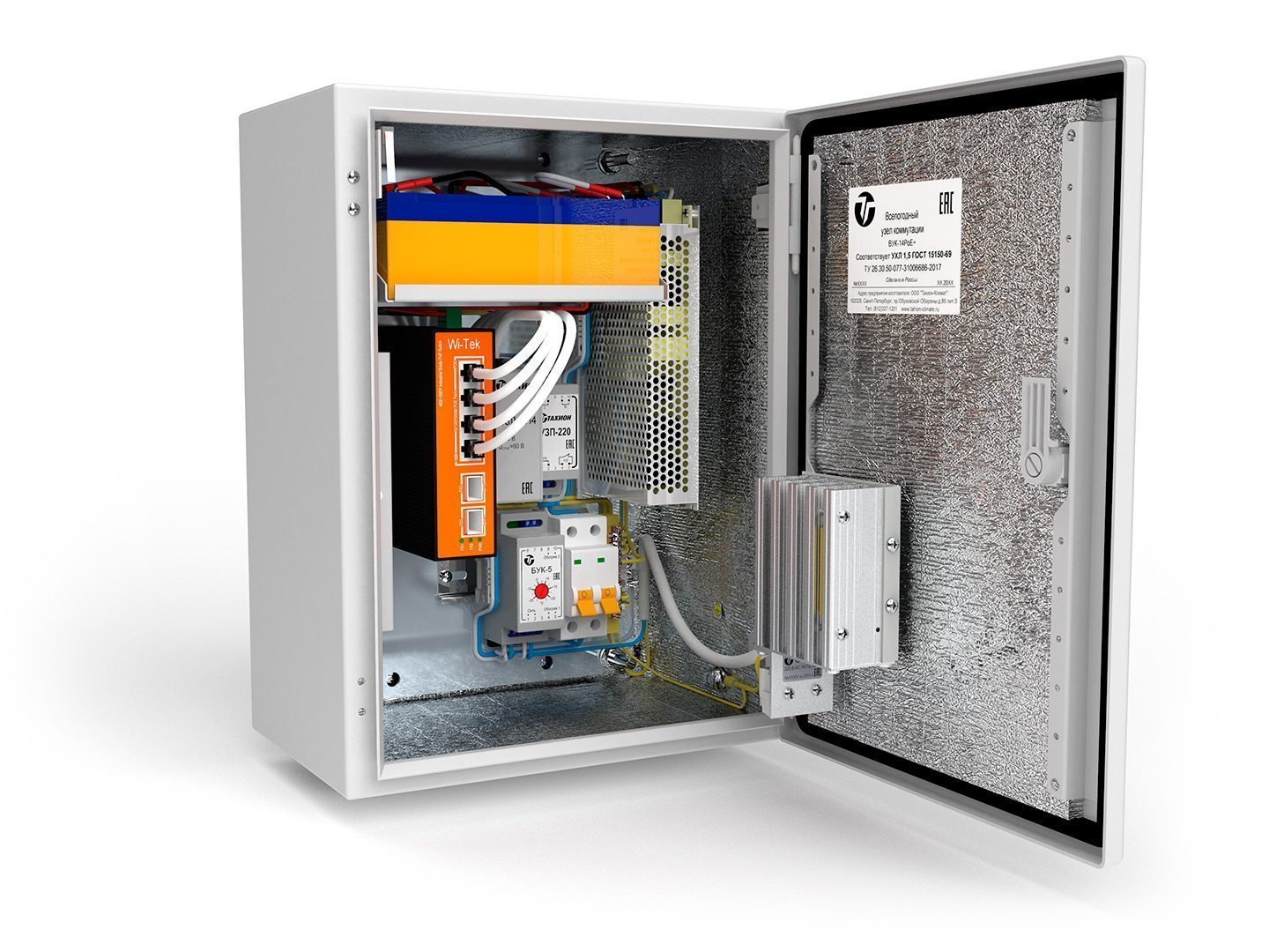 Всепогодный узел коммутации ВУК-24-PoE+ Р1 У11 У71 предназначен для обеспечения работы от 1 до 4 IP-видеокамер с питанием по технологии РоЕ/PoE+, организации группового канала передачи данных по волоконно-оптической сети, а также поддержания заданного температурного режима при эксплуатации задействованного оборудования. Комплектуется:устройством защиты электропитания УЗП-220 предназначенным для защиты оборудования, блоком защиты БЗЛ-ЕП4 предназначенным для защиты от импульсных перенапряжений, блоком управления климатом (БУК-5), предназначенным для управления обогревом; обогревателем термошкафов ОТШ-40, оборудованным встроенным биметаллическим выключателем, ограничивающим температуру поверхности радиатора до +90°С; комплектом бесперебойного питания (КБП-48/2,5 (2,2А·ч)) и тамперным контактом для сигнализации о несанкционированном доступе.