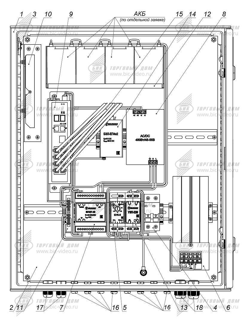 • блоком переключения питания с зарядным устройством БПЗУ-48, предназначенным для создания системы бесперебойного питания с использованием внешнего источника питания 48 В DC и четырех подключенных последовательно 12 В аккумуляторных батарей (АКБ);