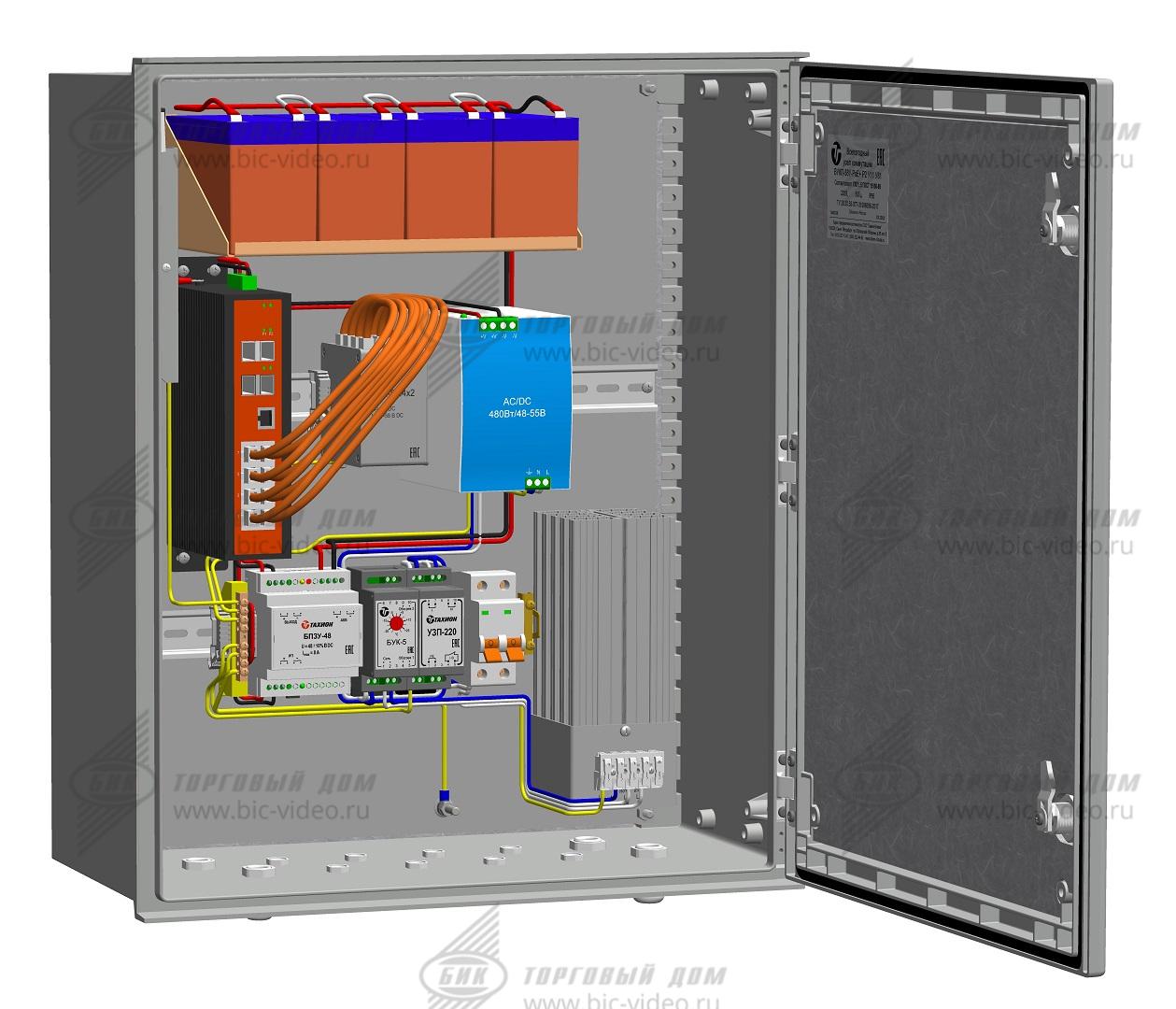 • блоком переключения питания с зарядным устройством БПЗУ-48, предназначенным для создания системы бесперебойного питания с использованием внешнего источника питания 48 В DC и четырех подключенных последовательно 12 В аккумуляторных батарей (АКБ);