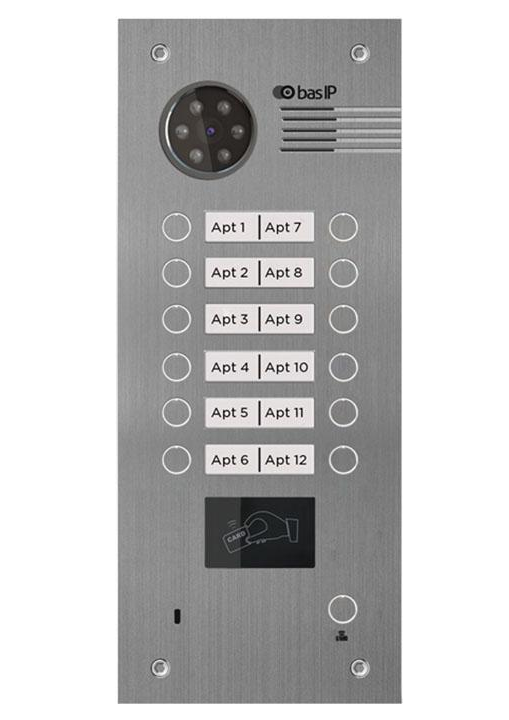 Вызывная панель на 12 абонентов. Считыватель карт и брелоков по стандарту Mifare® Plus и Mifare® Classic. Цифровая IP камера: 2 Мп. Угол обзора 100°. Врезной монтаж.