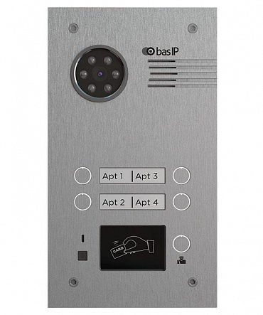 Вызывная панель на 4 абонента. Считыватель карт и брелоков по стандарту Mifare® Plus и Mifare® Classic.