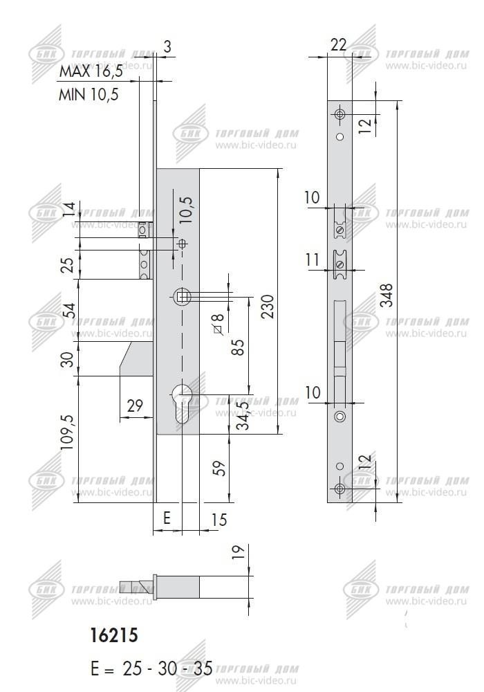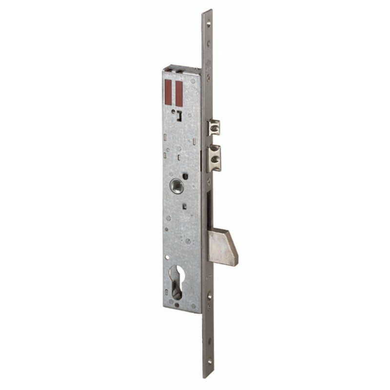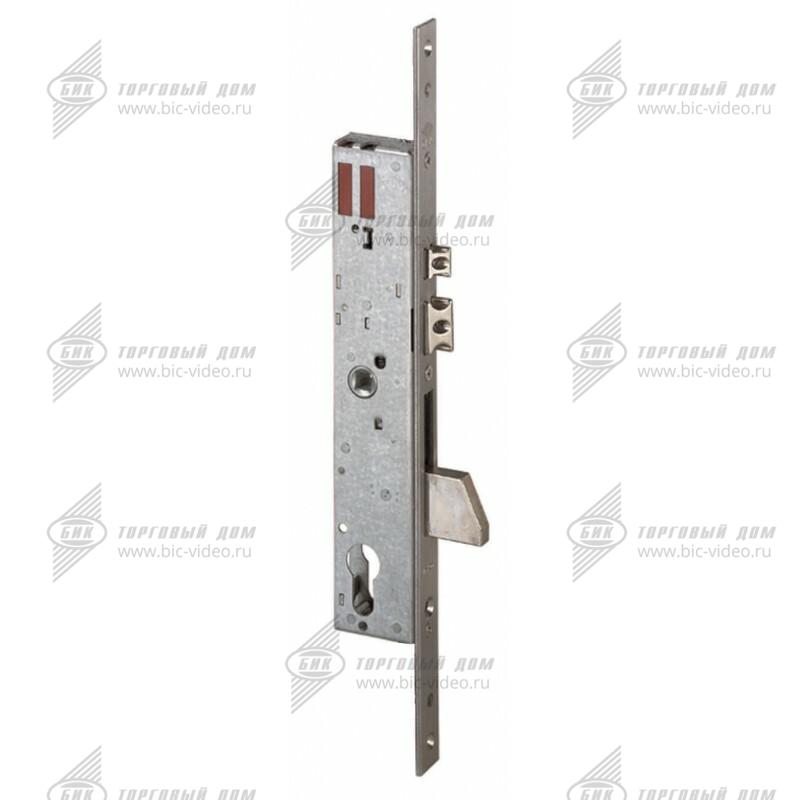 Врезной электромеханический замок CISA 16.215.35.0 с откидным ригелем для вертикального ребра жесткости, управляемый одним оборотом ключа в цилиндре европейского типа, имеет электрически управляемую защелку: взводной и запорный ригели. Замок, предназначенный для алюминиевых дверей, сертифицирован по 3 степени защиты в соответствии с европейским нормативным стандартом EN12209.