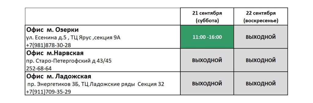 График работы офисов продаж 21.09.24 и 22.09.24