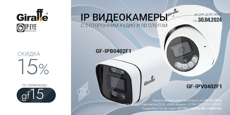Скидка 15% по промокоду на IP видеокамеры GF-IPV0402F1 и GF-IPB0402F1 до конца апреля.